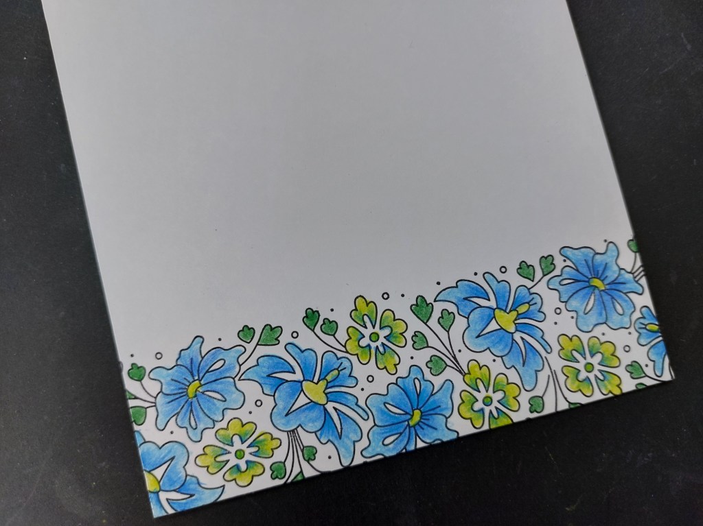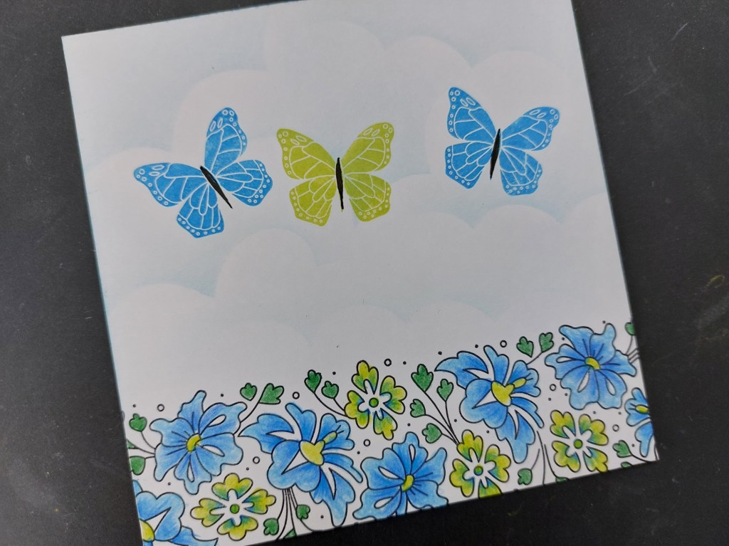 I cut a piece of Clarity’s stencil card to a 10.5cm square and stamped the ‘joy – floral panel’ strip across the bottom. I decided not to use the infill stamp to colour instead, instead shading with Pergaliner pencils which are brilliant for blending together. I then filled in the sky area by brushing ‘tumbled glass’ Distress Oxide across Clarity’s ‘clouds’ mask, before adding one of the butterflies from the ‘Japanese flowers & butterflies sampler‘ set, once in ‘twisted citron’ and twice in ‘salty ocean’.