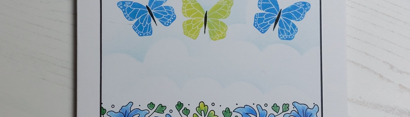 I cut a piece of Clarity’s stencil card to a 10.5cm square and stamped the ‘joy – floral panel’ strip across the bottom. I decided not to use the infill stamp to colour instead, instead shading with Pergaliner pencils which are brilliant for blending together. I then filled in the sky area by brushing ‘tumbled glass’ Distress Oxide across Clarity’s ‘clouds’ mask, before adding one of the butterflies from the ‘Japanese flowers & butterflies sampler‘ set, once in ‘twisted citron’ and twice in ‘salty ocean’.