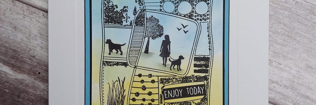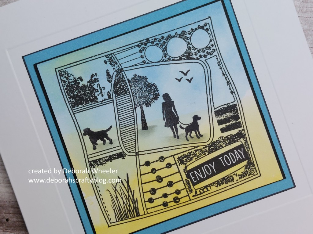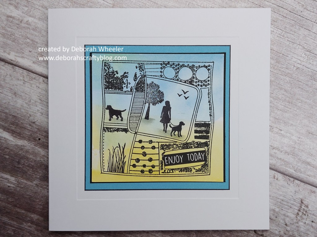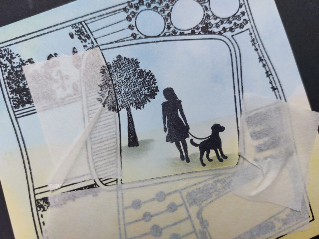 Today’s starting point was one of my inky mop-up backgrounds in blue & yellow on a small square of Clarity’s stencil card – I simply stamped one of the montage layouts onto it in black Versafine Clair ink. I could then use low tack tape to mask off the central area and add in my sister walking her dog (!), using a scrap pf torn paper and a spot-on sponge with ink to create the ground shadow.