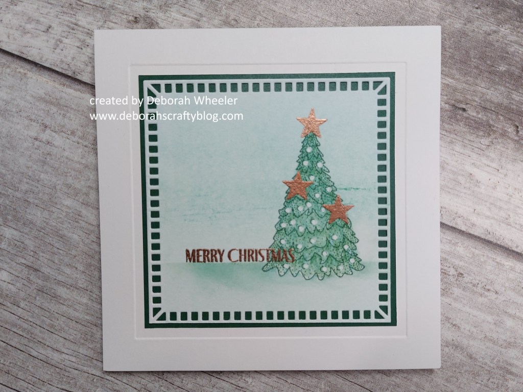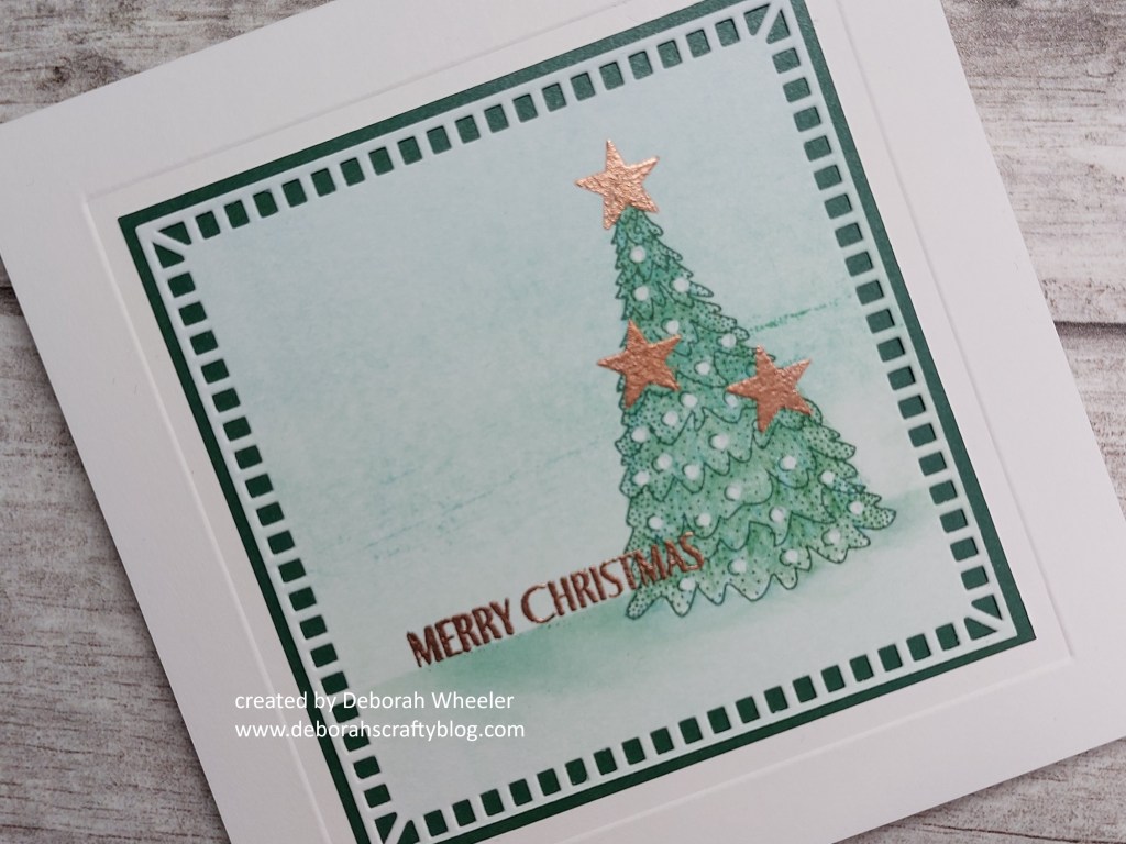 I heat embossed the sentiment with the copper powder and highlighted the baubles on the tree with a white Posca pen. I then cut the topper down a little using one of the ‘film strip‘ nested doodle frame-it panel dies and added a mount of Antarctica companion paper. I used a square embedder to emboss the frame on a 5×5 card blank and sat the topper neatly within it.