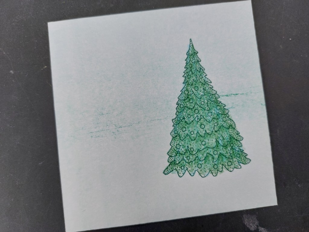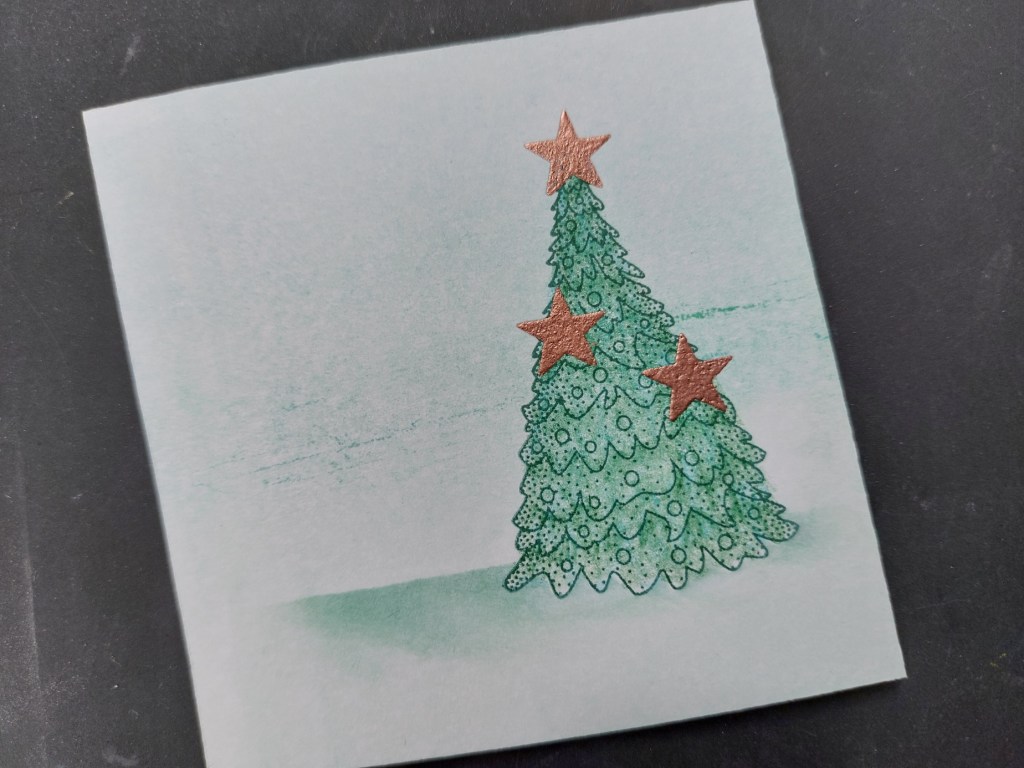 I started today with a piece of card that I’d cleaned my brayer off on and cut it down to fit on a 5×5 card blank – the background colour was ideal for HSS’s palette. I stamped the tree with ‘library green’ Archival ink then shaded it with Pergaliner pencils, blending a turquiose and dark green to get the right deep teal shade. I’d previously cut a mask for the tree from Clarity’s blank material, so covered it over and sponged ink across a bit of torn copy paper for the ground. I then stamped one of the solid stars from Linda’s wish upon a star set three times onto the tree and heat embossed them with WOW’s metallic copper powder.