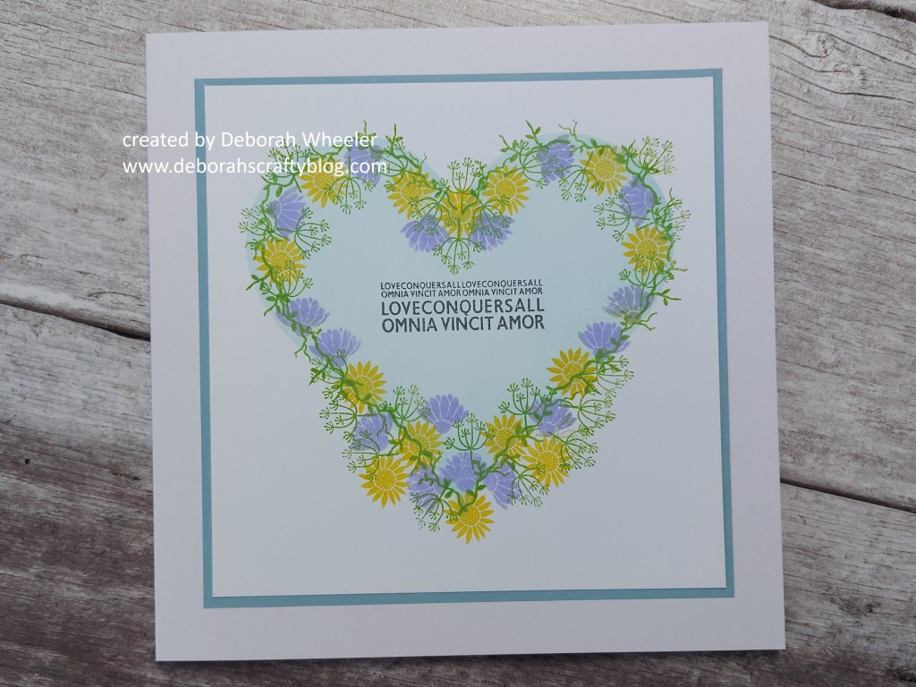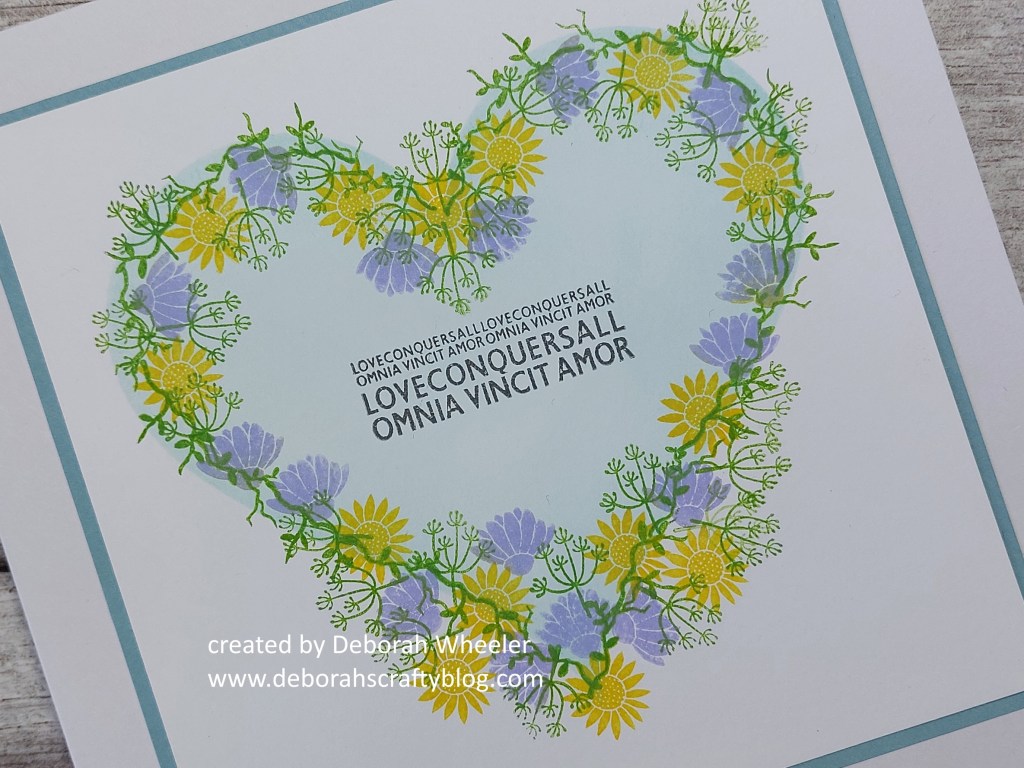 Deborah, your wreath turned out beautifully. The design with the stenciled heart and love conquers all sentiment is absolute perfection for a wedding or anniversary. So gorgeous! Thanks so much for joining in at the Paper Players this week!