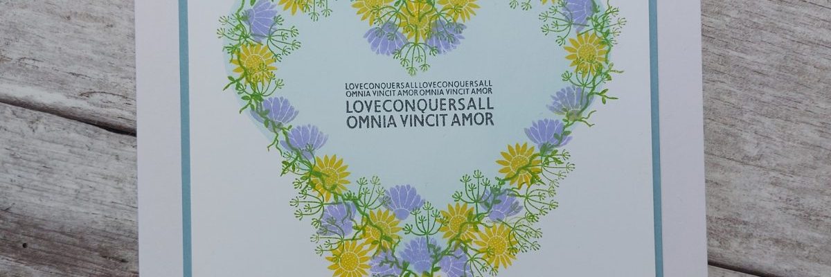 I then set about building my wreath with the stamps, starting with a couple of leafy sprays around the edge of the stencil in ‘mowed lawn’ Distress Oxide, which outlined the shape. I added yellow daisies with ‘mustard seed’ Distress Ink, another of the flowers (don’t know what type they are!) in ‘shaded lilac’ and finally the little cow parsley sprays again in the ‘mowed lawn’. I’m a bit cross as I slightly overcooked it at the bottom of the heart – there’s a daisy each side that I should probably have left out!