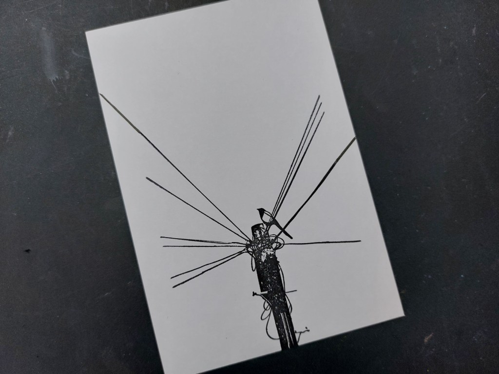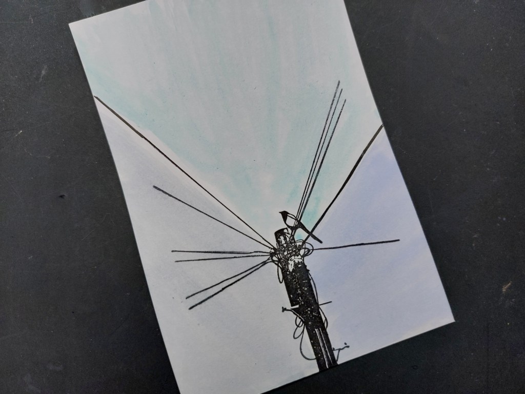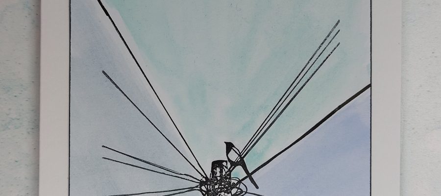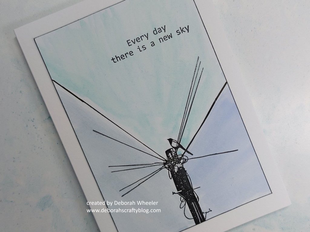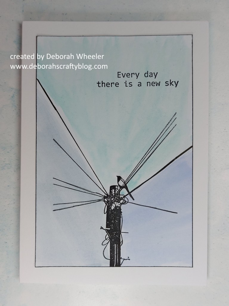 First was to cut a piece of stencil card to fit an A6 card blank and stamp the magpie image onto it using black Archival ink. I extended two of the telegraph wires with a micron pen to reflect the sketch. I then simply used a flat paintbrush and a mix mat to watercolour the three sections with ‘salvaged patina’, ‘stormy sky’ and ‘blueprint sketch’ Distress Oxides.