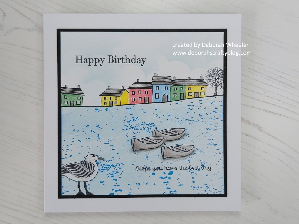 Now, you know I love a bit of masking and scene building so this one is totally in my confort zone! I started with a piece of Clarity’s stencil card that I’d cut to 5″ square and first stamped the row of cottages across the centre. The stamp isn’t long enough to go all the way across, so I lined it up again from the left hand side and addded another house on the end – the trick with this is to join up the line along the bottom of the cottages, so I popped a little low tack tape across the end of the first stamped row (just leaving the edge showing). That way I could overlap the line without getting a very thick stamped image. I then added the smaller of the two trees, the large seagull and two rowing boats.