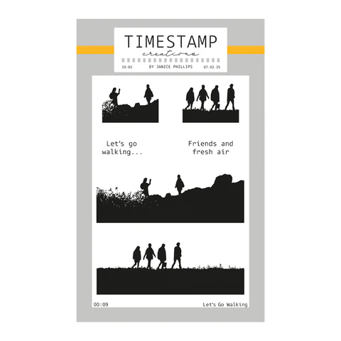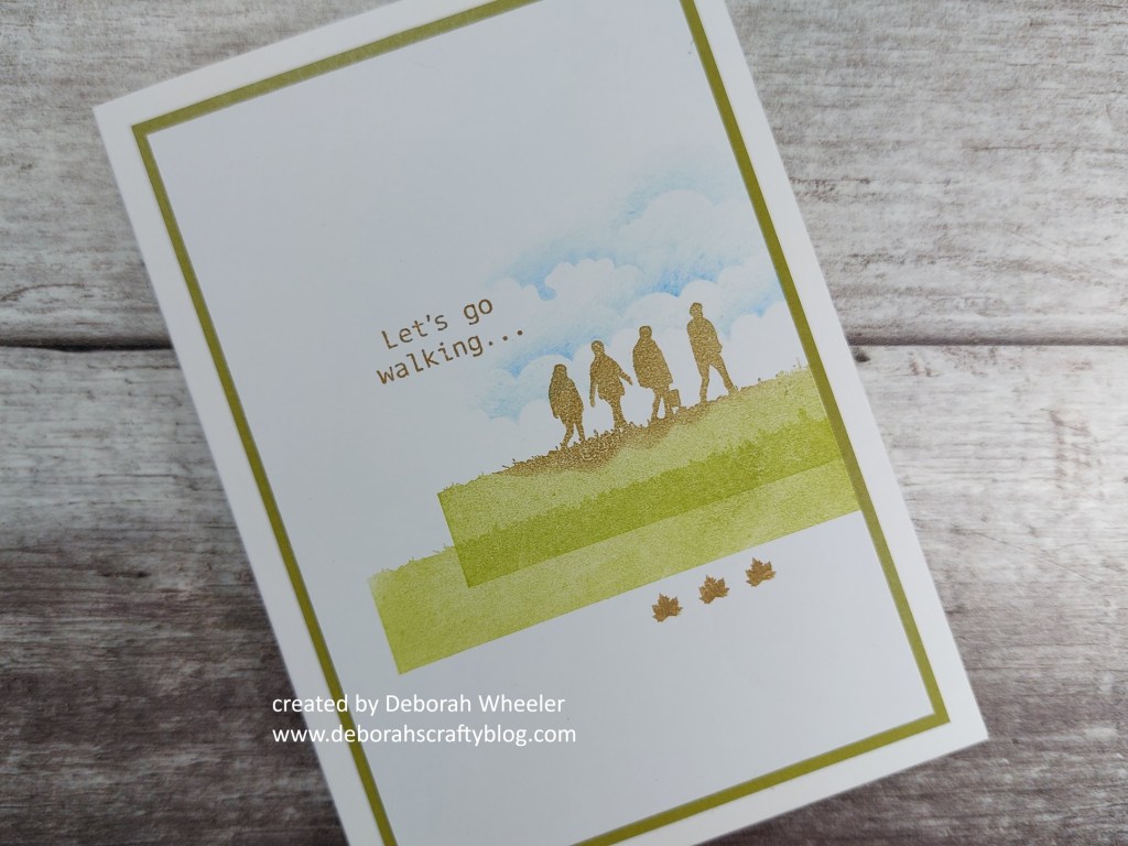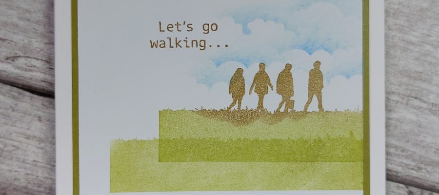 I first cut a piece of card to fit on an A6 card blank, then sponged ‘gathered twigs’ and ‘peeled paint’ Distress Ink onto one of the stamps, using the brown to highlight the group of walkers.