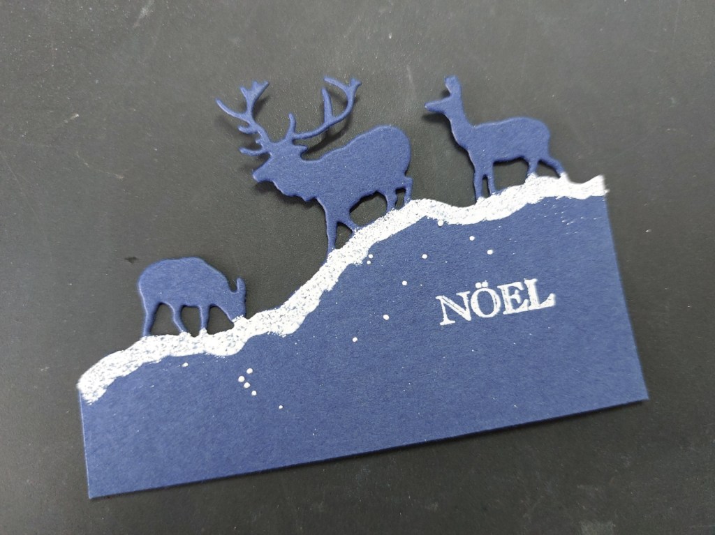 I first cut the die into a piece of navy cardstock, then trimmed it out of the aperture and cut it to 3.5″ wide so that it would fit on my topper. I ran WOW’s clear ink pen across the top edge and heat embossed a snowy landscape with their white superfine powder. I also heat embossed the sentiment from Jayne’s bijou postcard set. Now my plan at this point ws to also sprinkle WOW’s ultra high embossing powder onto the deer and heat set it, but it all blew off every time I tried to heat it from underneath as the deer shapes are too small, although a few sprinkles did stay on the card base. Needless to say, I abandoned that plan!
