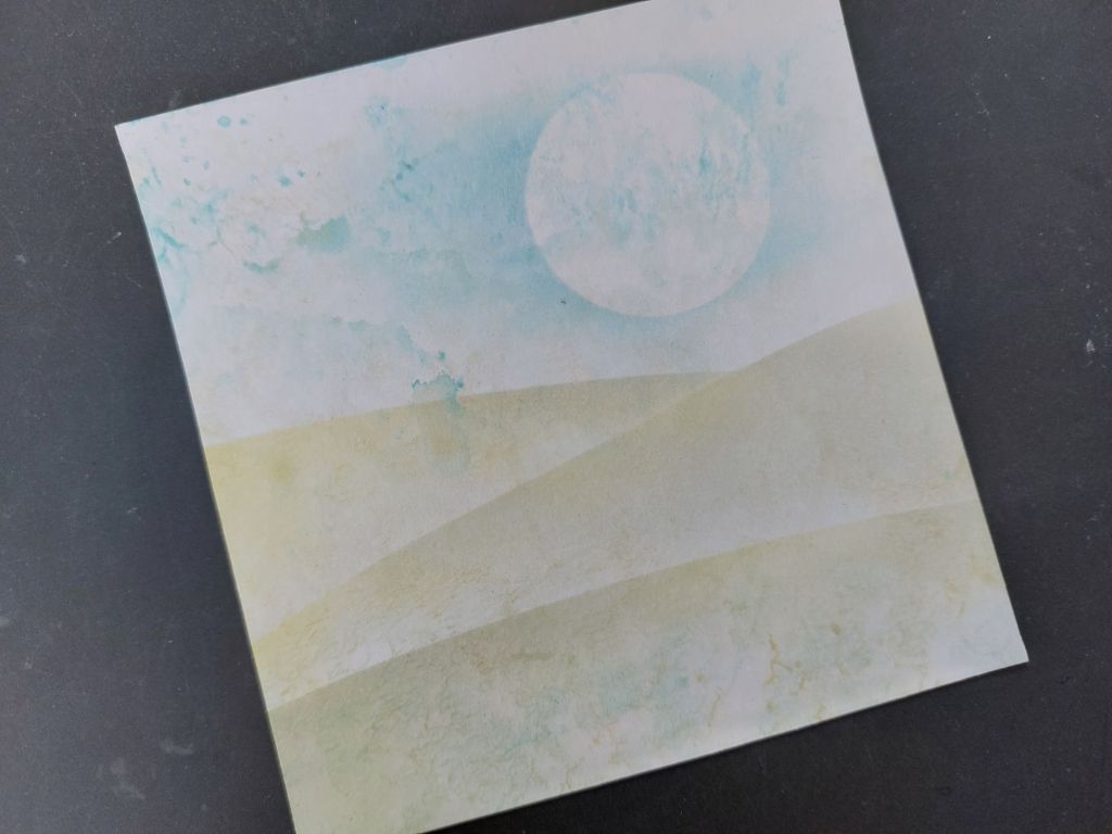 You may remember from yesterday’s card that I’d been rummaging in my folder from last year’s Clarity summer retreat and today I’ve got another of the backgrounds I made there as the basis for this card. For this one, we were spreading acrylic paints onto a craft mat, spritzing then with water and picking the paint up onto stencil card. I cut a square from one of the backgrounds and then used Clarity’s south downs 6×6 mask to create a landscape – I sponged ‘antique linen’ and ‘pumice stone’ Distress Oxides to create the ground. I popped a moon mask into the sky and dragged ‘broken china’ Distress Oxide across it with a sponge.