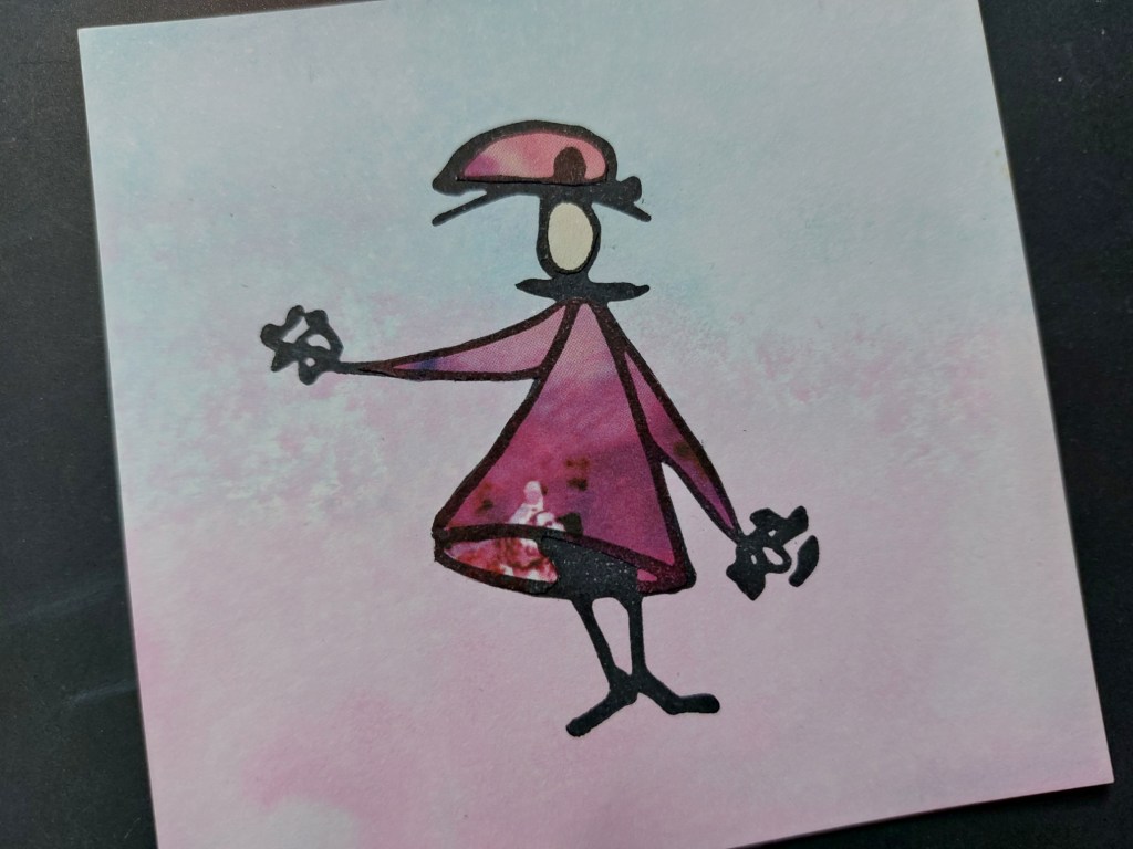 I found an inky background in my stash (no surprise there!) with lovely shades of blue and pink and stamped my SHAC lady onto it using Versafine Clair black ink. I stamped her again on an offcut of Amazonia designer paper and fussy cut her dress, hat and face, gluing them all onto the main piece.