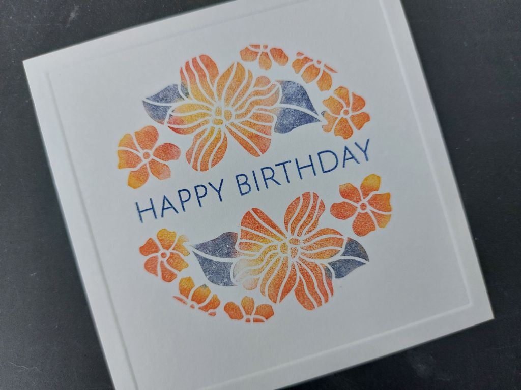 I then set about inking up one half of the floral round stamp, adding ‘carved pumpkin’ and ‘candied apple’ Distress Oxides with sponges. I wanted to pick out the small leaves in the dark blue but the sponge covered too big and area, so instead I used a cotton bud to pick up ‘chipped sapphire’ and dab it onto the two leaves. Once the stamp was fully inked I planted it above the sentiment, then repeated the process, turned the card round and stamped it again at the bottom to complete the circle.
