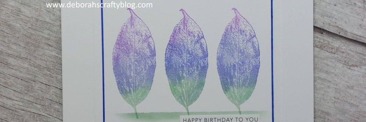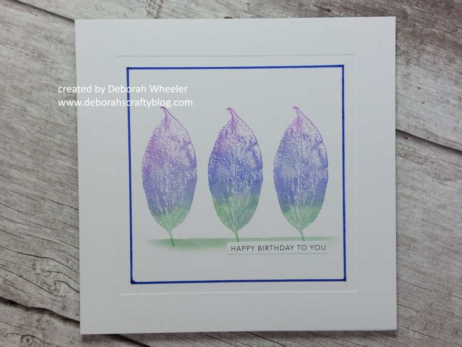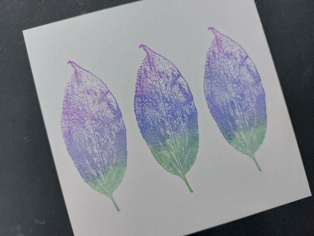 Now, you may have noticed that I love a bit of ink blending, so I went for it again with these stamps. I used sponges to blend ‘lucky clover’, ‘blueprint sketch’ and ‘wilted violet’ Distress Oxides onto one of the leaves from Elementree set 2 and stamped it three times on a small square of stencil card, to reflect The Paper Players’ sketch.