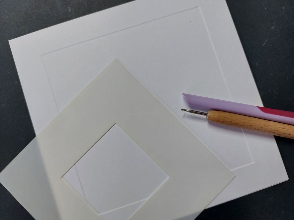 You may have spotted that I also love using Clarity’s embedders to emboss frames onto my cards and I thought I’d just take a minute to refresh the technique for you too. I used one of the square nested embedders on this 6×6 card blank as it was the right size to frame my topper (as good a reason as any!) I used low tack tape to hold the embedder on the front of the card, then turned to the inside to emboss it. I was previously using a bone folder to initially locate the embedder, but have now discovered that the base of the new stamp pens works really well – they are angled so it’s easy to run them around the embedder to make the initial crease, before sharpening it up with a #2 embossing tool.