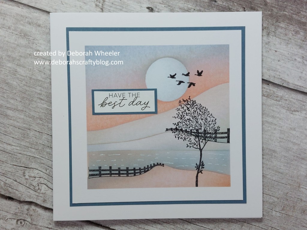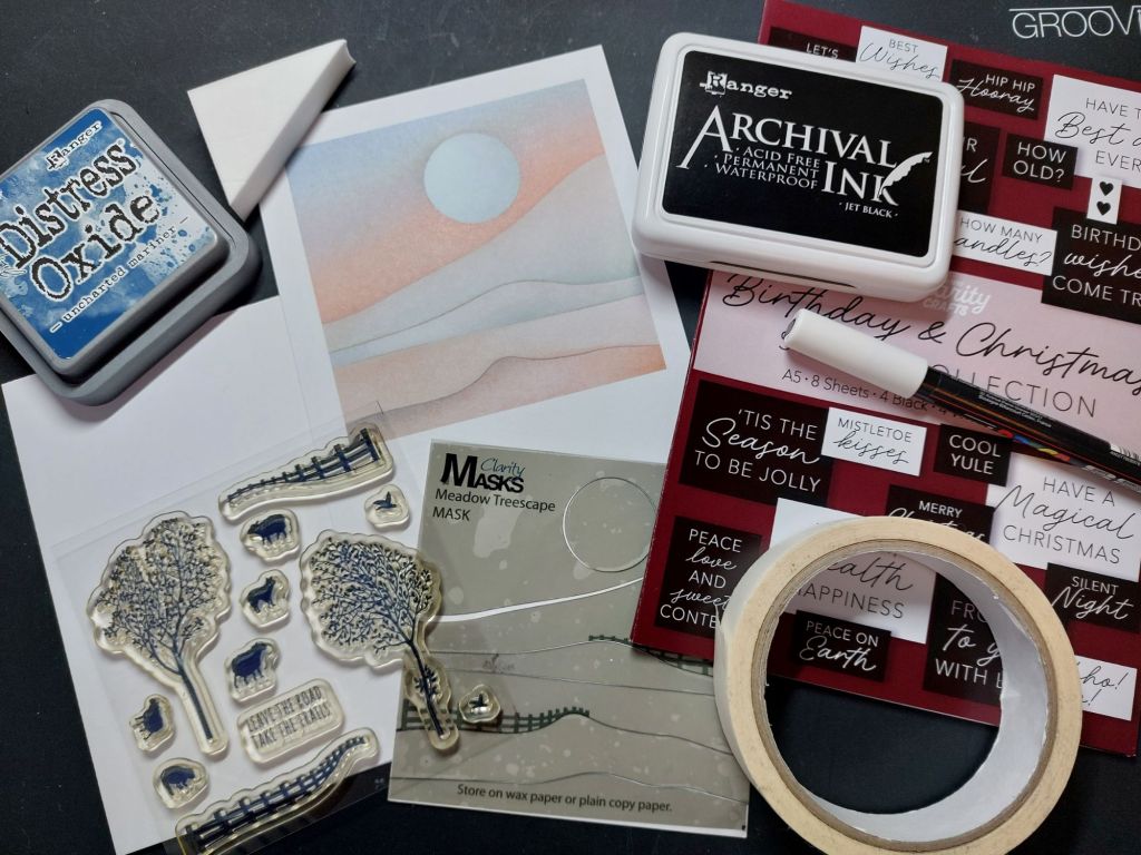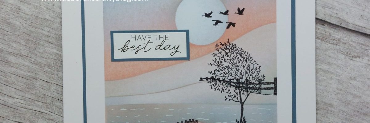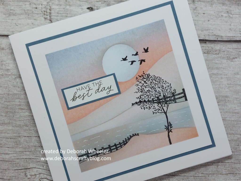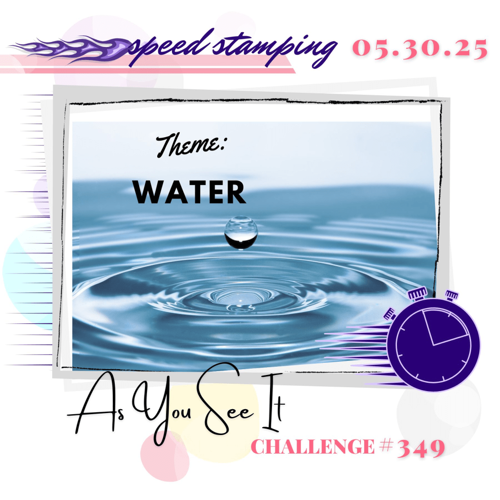 Hello crafty friends. As promised, here’s my second card for today, this time for our new challenge at As You See It. It’s the return of our dreaded speed challenge to make a card in less than 10 minutes, this time on the theme of water. I’ve recently been working my way through Clarity’s online 1-2-3 landscapes course using these toppers and their landscape masks – as they were out on my desk they were an obvious choice for a quick card, together with the meadow treescape stamps.