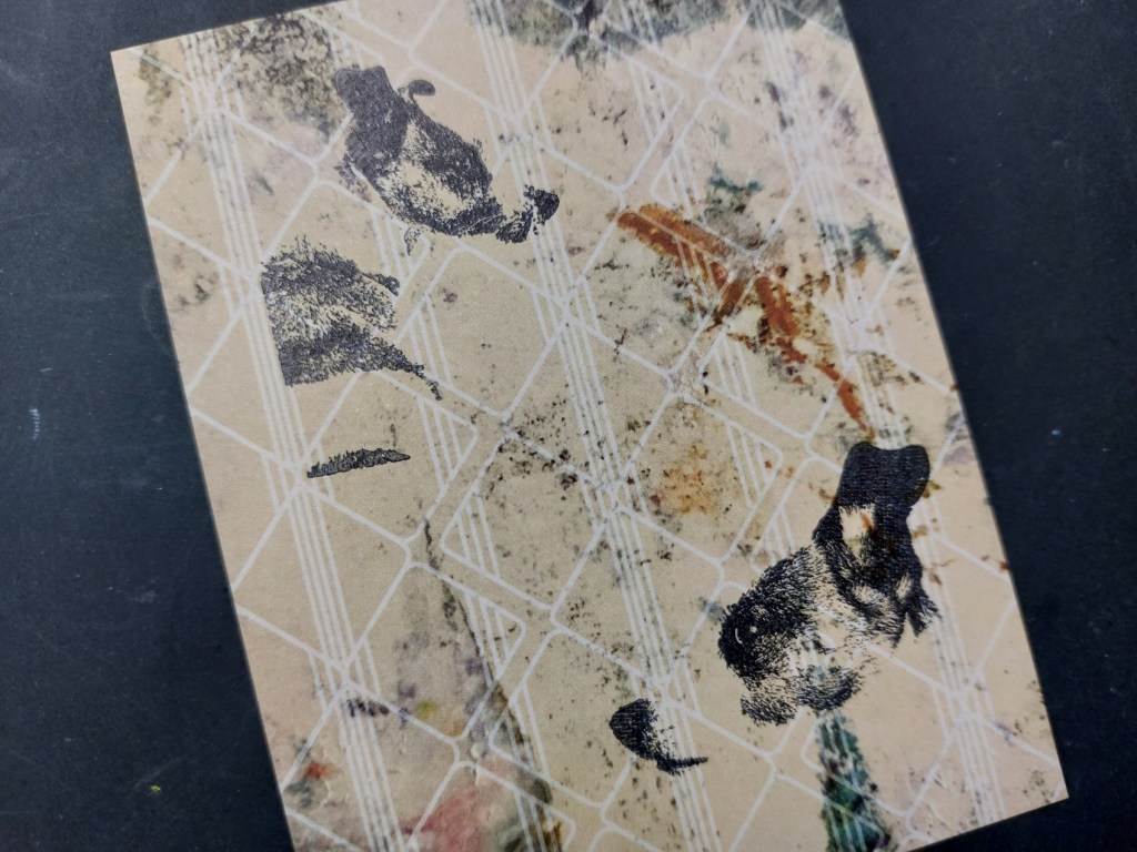 So, here’s the lowdown on the simple process for this! As I said above, I took one of the notecards from Sam’s papers and used the reverse side as my topper, stamping two of the images of Millie (Janice’s dog) in black Archival ink.