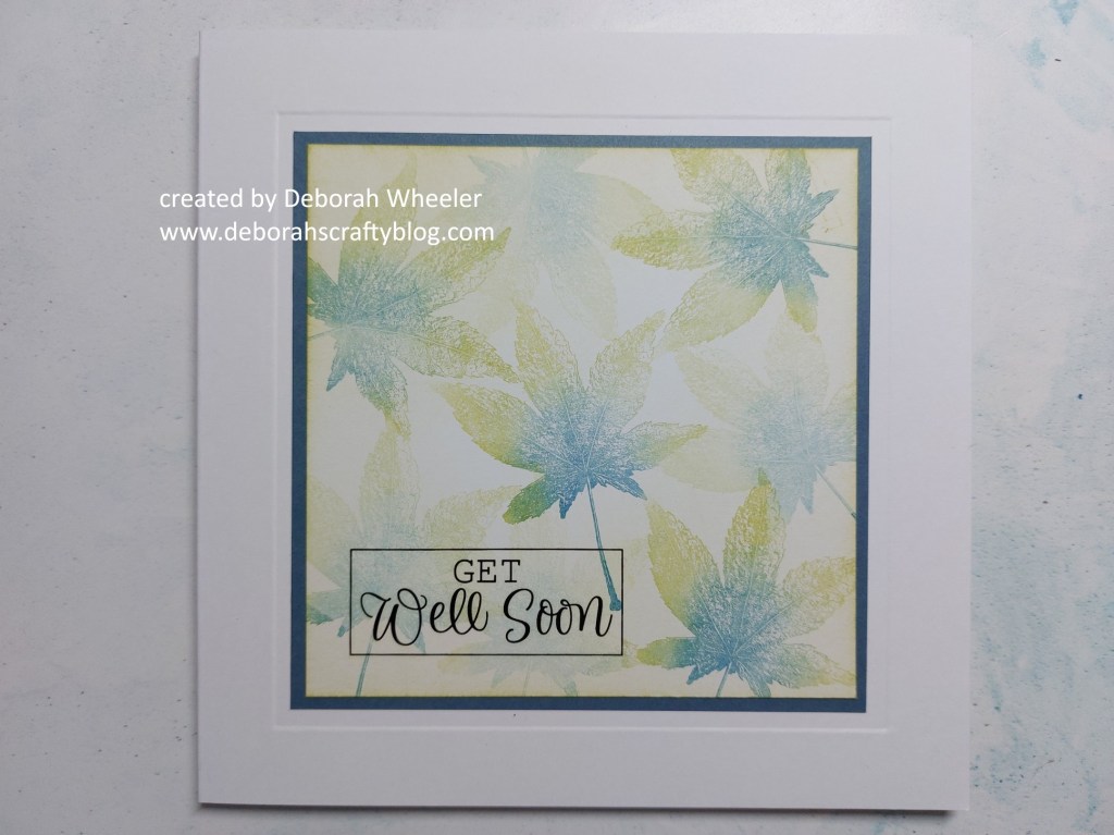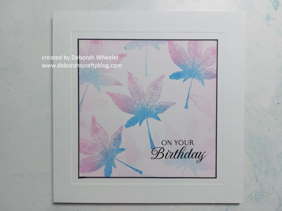 I started with a 4.25″ square of stencil card and chose one of the Elementree leaf stamps. For this one, I blended ‘uncharted mariner’ and ‘peeled paint’ Distress Oxides onto the stamp using a spot-on sponge. I then stamped the leaf in the centre of the card and then repeated it again to the side without reinking (that’s the second generation). I repeated the exercise until the card was filled with leaves doing my best to get a random pattern.