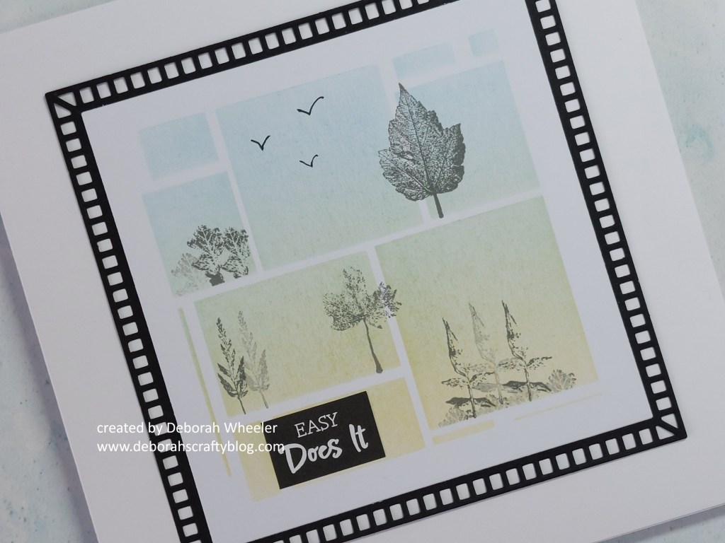 I then stamped a variety of the smaller leafy images into the squares with ‘watering can’ Archival Ink, using low tack tape to mask off the lower edge each time. I drew a few birds with a micron pen, then popped the topper onto a mount cut with one of the film strip nested square doodle frame-it panel dies and attached it to a 6×6 card blank. The final touch was one of the Pinky Gray greetings stickers.