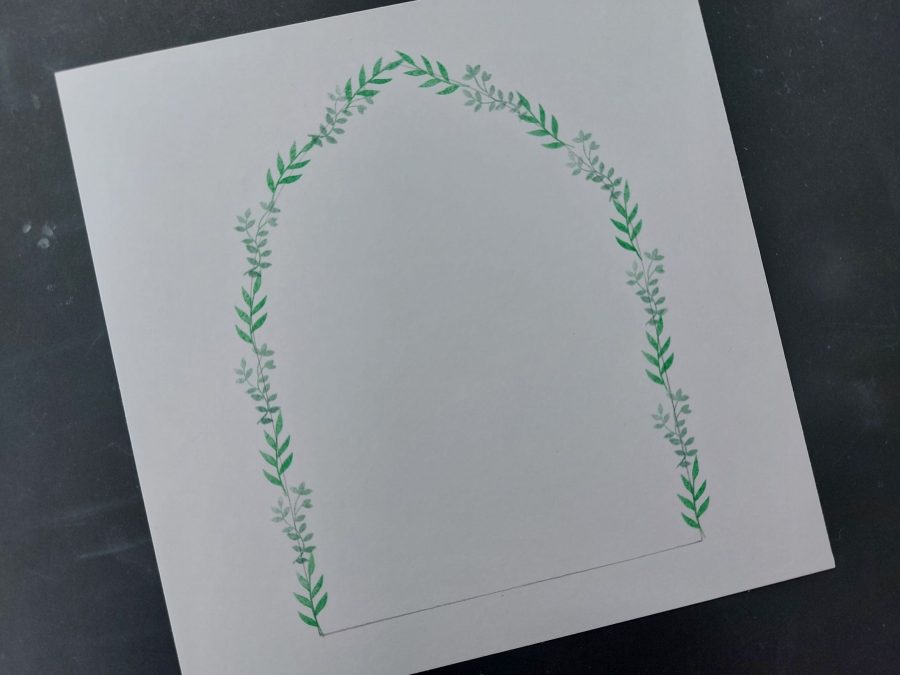 The pink card was the first one I made in this pair. I drew the arch pencil guideline using Clarity’s stencil, then stamped two of the leafy images from the set in ‘lucky clover’ and ‘evergreen bough’ Distress Oxides, alternating them around the guideline.