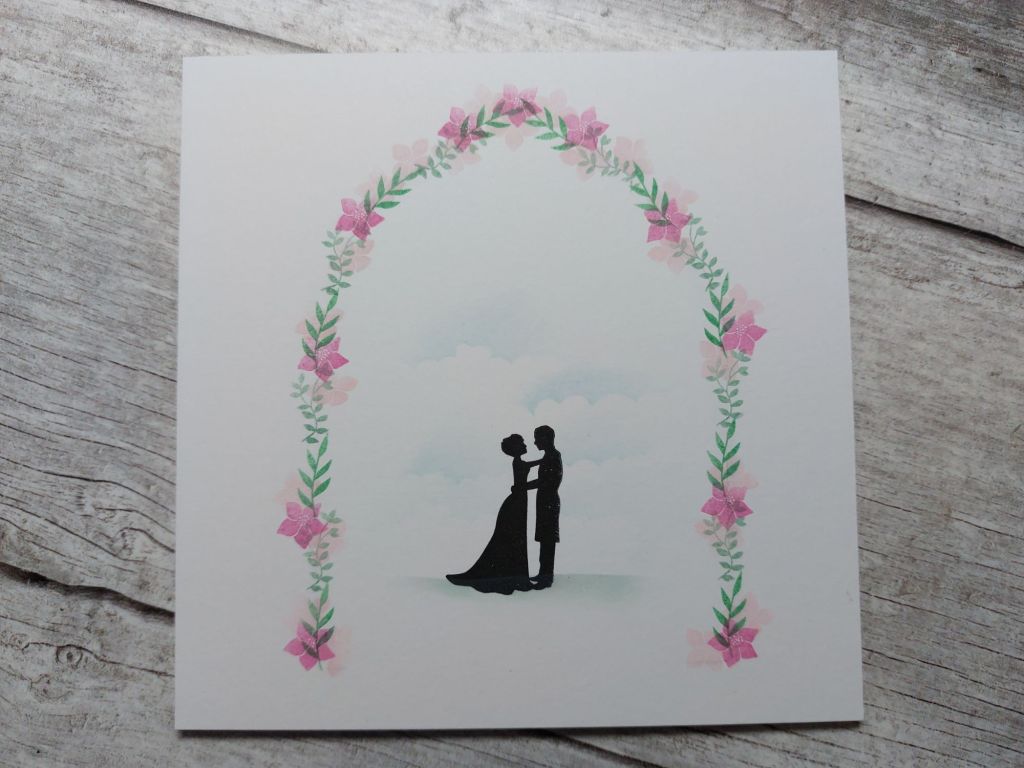 I next added in two of the flowers to the arch, using ‘picked raspberry’ and ‘spun sugar’ Distress Oxide. The clouds mask from the Build a Scene set was the perfect size for brushing a little ‘broken china’ across to create the sky. I then stamped the couple from the Wee Wedding set in black Archival and gave them ground to stand on by sponging a little of the ‘evergreen bough’ ink across a piece of torn copy paper.