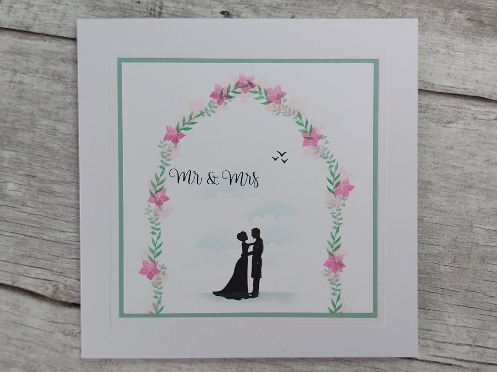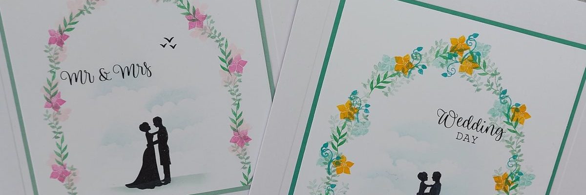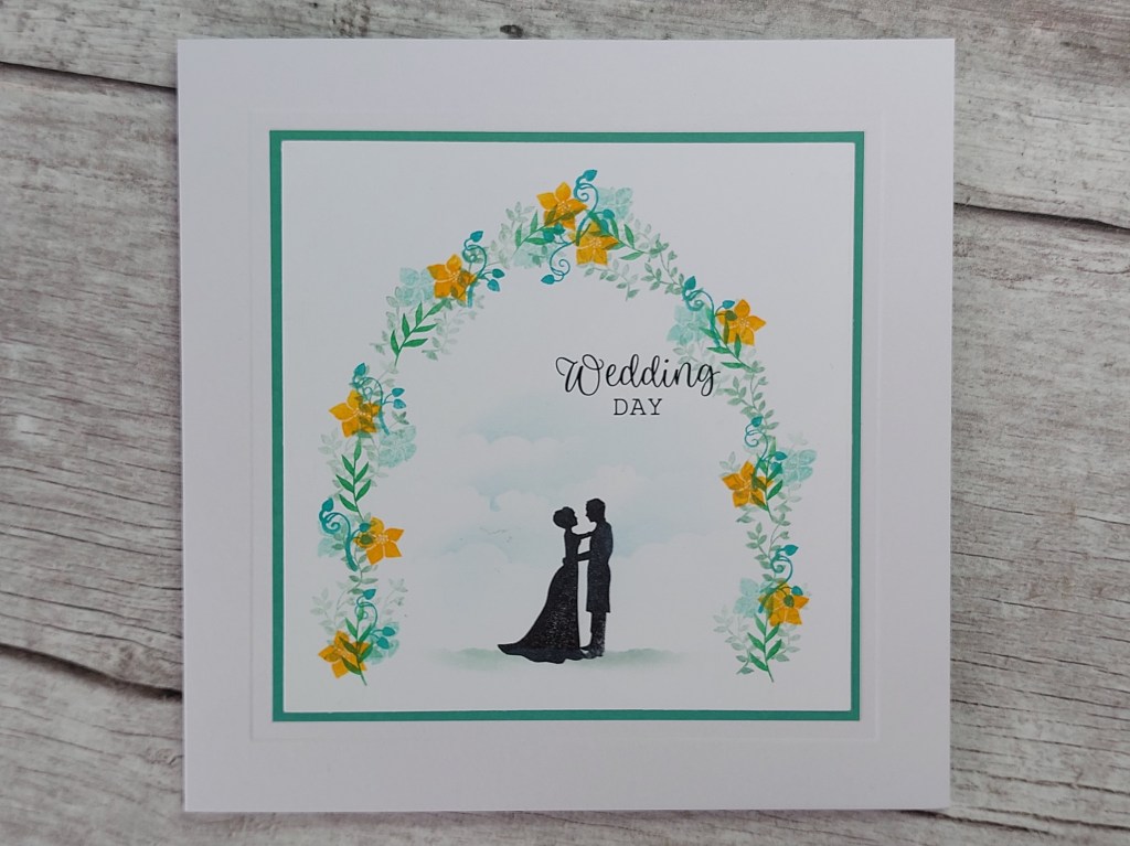 Hello there. I’m back with card 2 for today, and am delighted that CAS on Friday invited me along as Guest Designer for their new Summer theme challenge. It’s a prime time of year for weddings, so that sorted the reason behind my card – and the sharp-eyed amongst you will have spotted that it’s another use for my current favourite Summer Build a Wreath stamps! I thought they were perfect for building a floral arch for the happy couple.