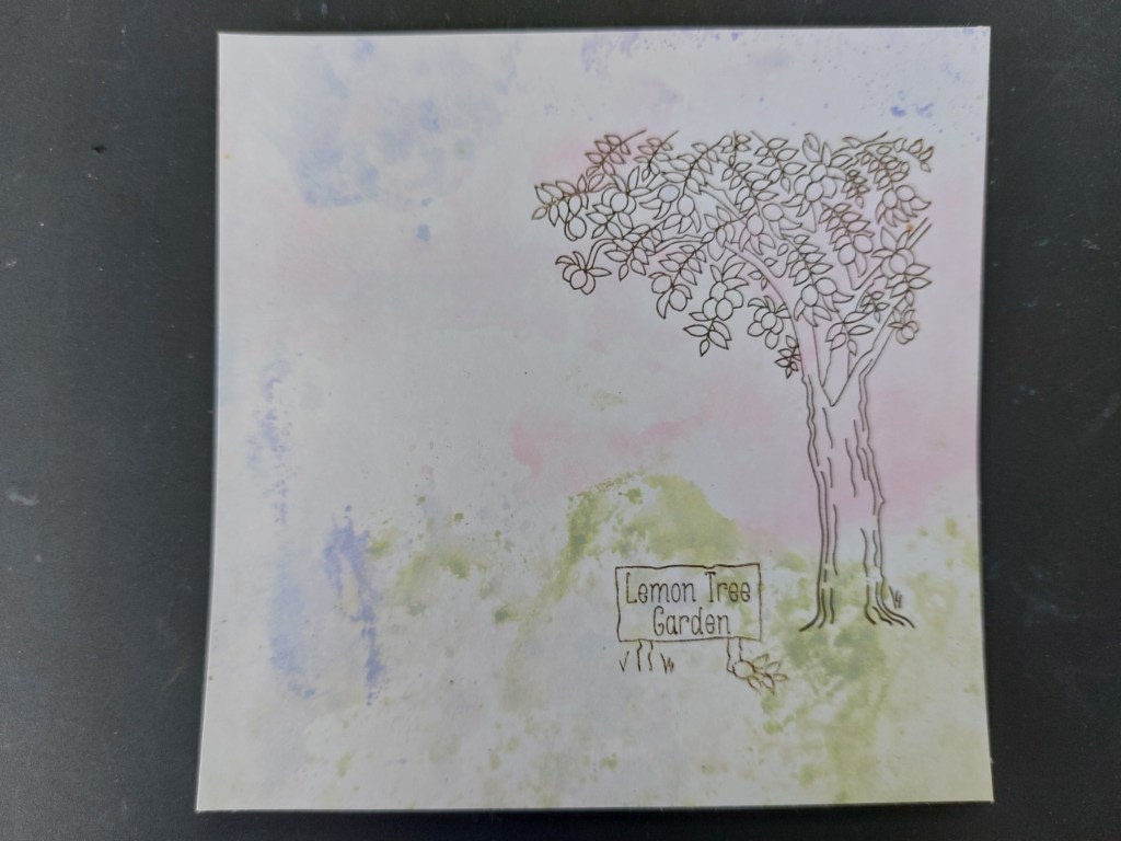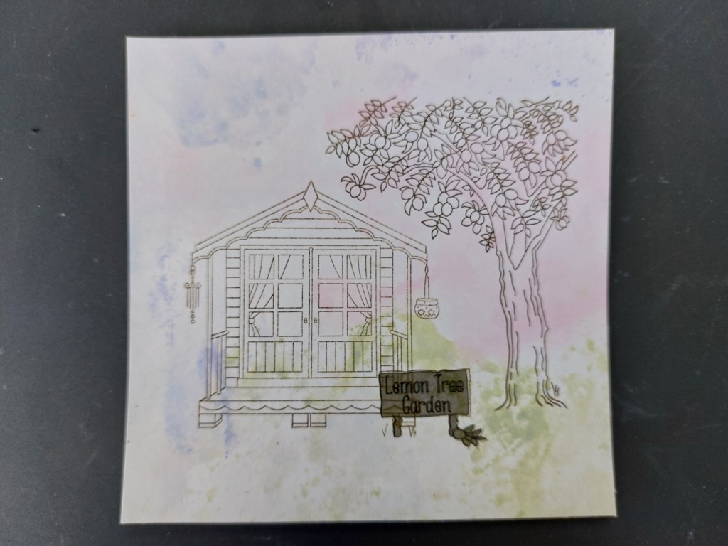 I started with an inky mop-up piece of stencil card from my stash that had lovely tones of blue, pink & green on it. I stamped the tree and sign into place, then masked off the sign and stamped the summerhouse to sit behind it.