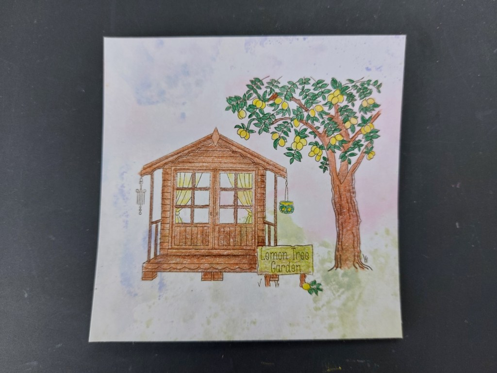 I then set about colouring the images with my trusty Pergaliner pencils – I kept the shading quite rough over the summerhouse & tree trunk to try and give it the appearance of wood.
