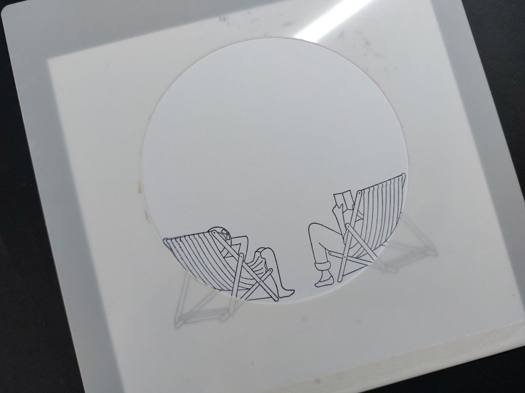 I worked directly on a 6×6 card blank for this one and started by positioning the Circle Frame stencil over it, attaching it with low tack tape. I lined the two deck chair stamps up on top of the stencil so their curves followed it’s edge and picked them up on a 5.5″x4″ Mega Mount. After flipping the stencil away from the card front, I stamped the two deck chairs into place with black Archival ink and dropped the stencil back into place over them.