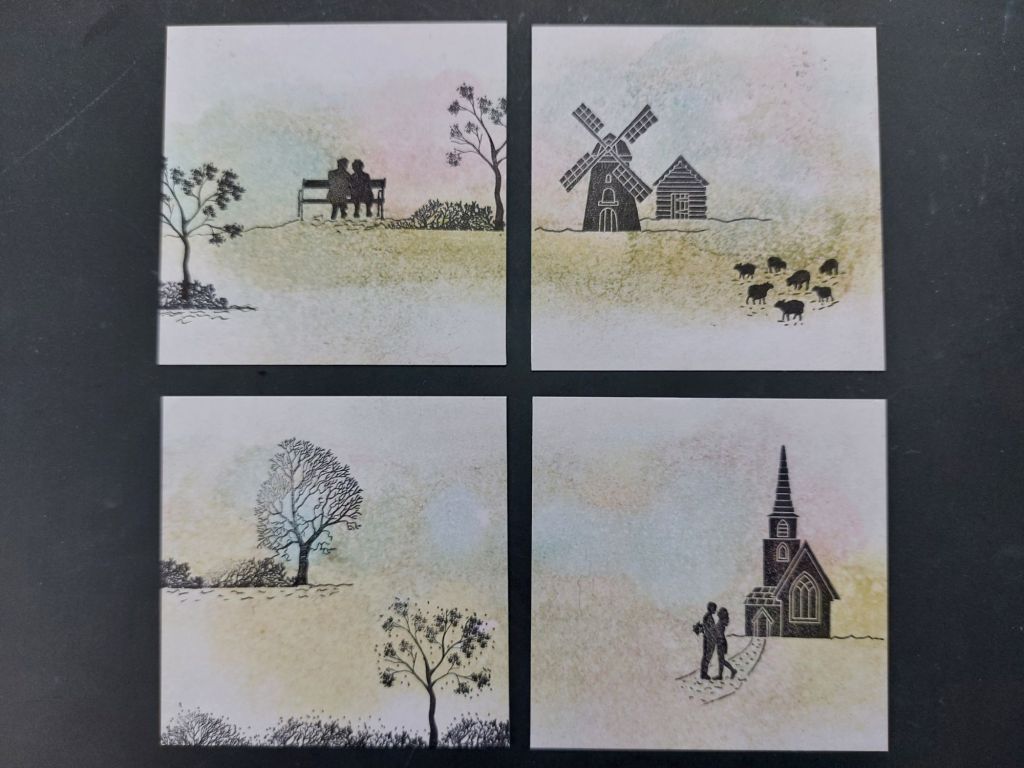 There are lots of lovely pastel tones in the various companion papers and I had a fun time choosing a different shade for each topper. I pulled out four 6×6 card blanks, used a square embedder on the front of each one to emboss a frame and then simply attached a topper to each card. I used a white Posca pen to dot the fleeces onto the sheep, but left them all without sentiments, apart from the wedding/engagement one to which I added one of the anniversary/wedding Rub Ons. I’ll decide on the rest when I come to use them…