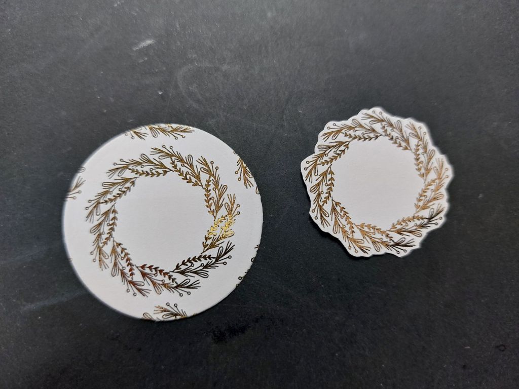 I decided to cut out three of the small wreaths to use with the sketch and initially cut them out with a small circle die. They didn’t look right, though, so I grabbed my scissors and fussy cut them – much better!