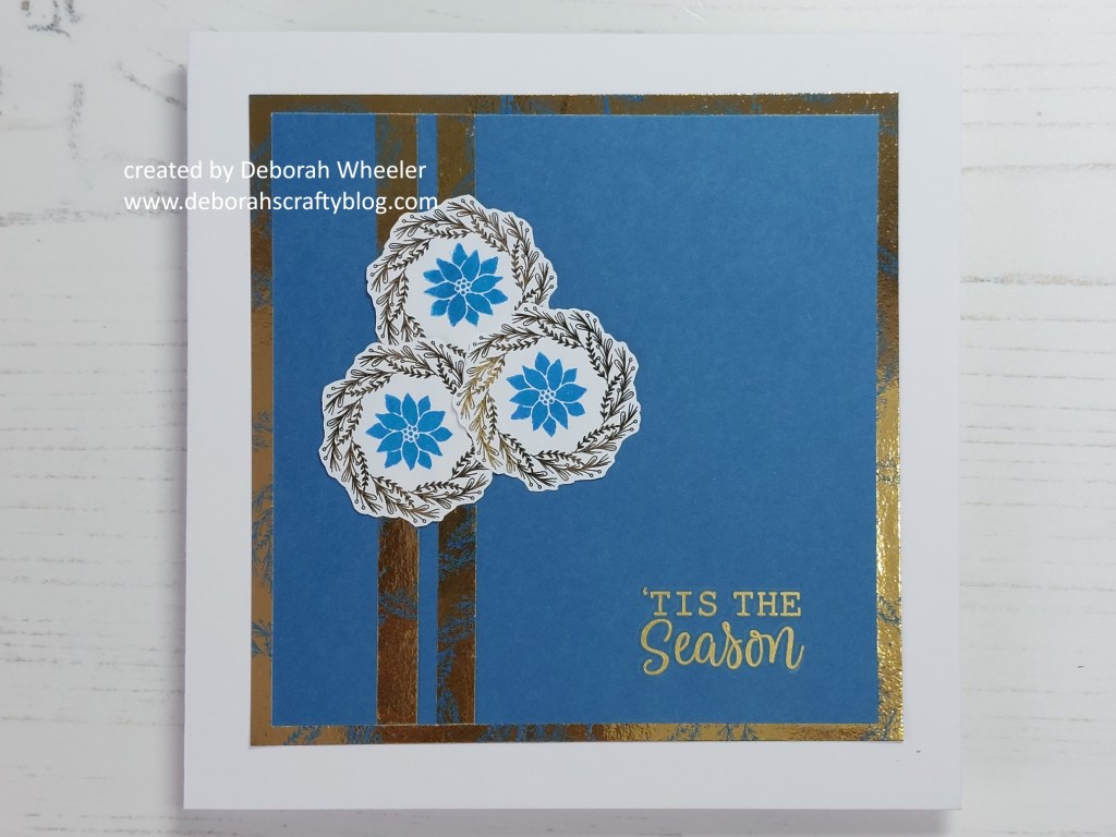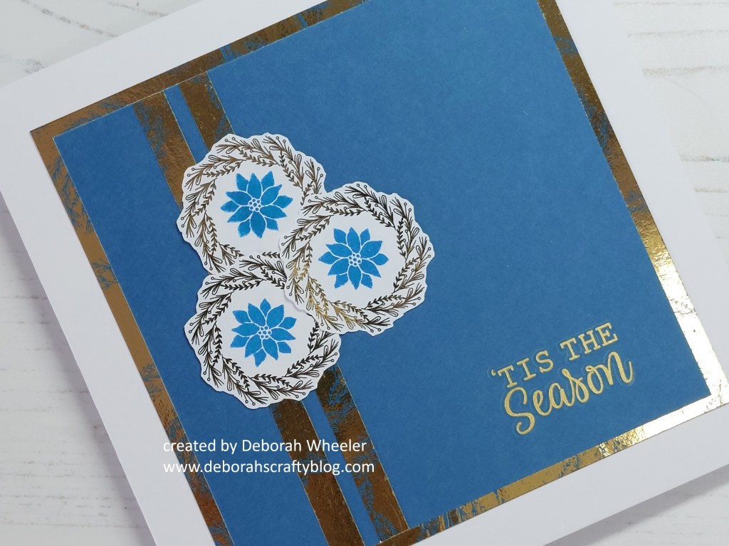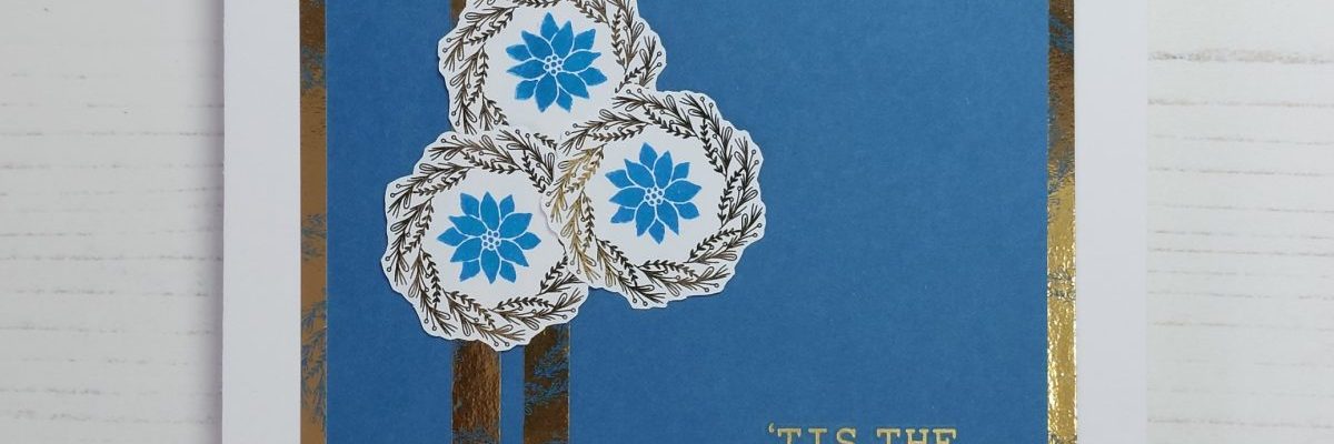 I popped the background onto a 5×5 card blank and added a gold Rub On sentiment. The wreaths looked empty when I lined them up, so it was out with my Winter Build a Wreath stamps to add a little poinsettia in the centre of each with ‘bluebird’ Archival ink.