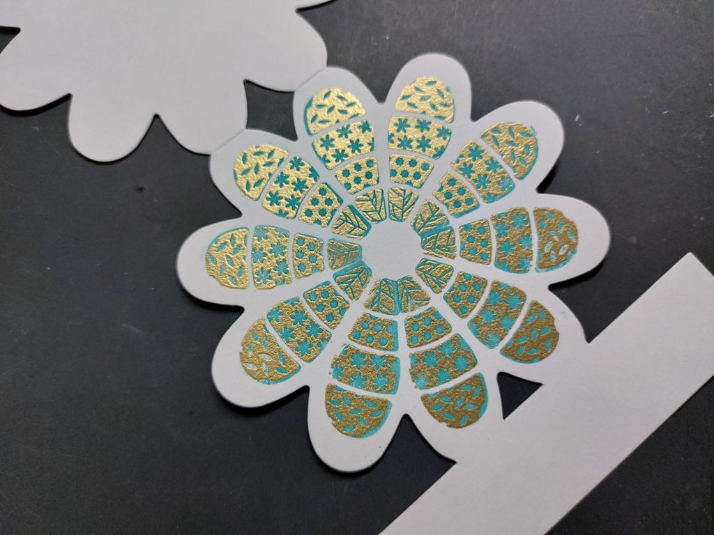 Next, I took two of the small die cut toppers and again stamped the co-ordinating image onto them before heat embossing in gold. This time, rather than fill in the whole petal, I opted to just use the ‘peacock feathers’ on the small centre stamp.