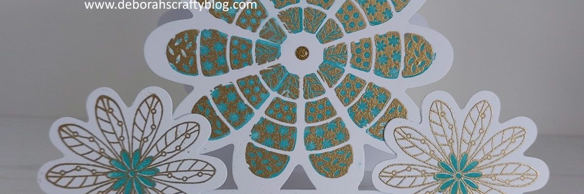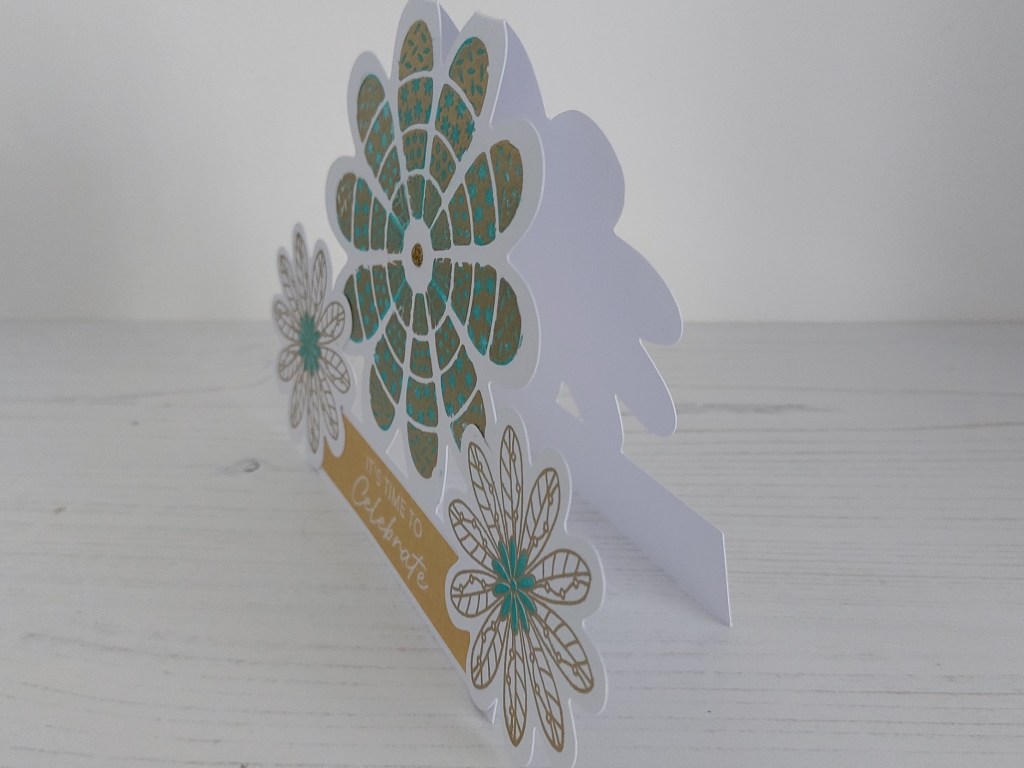 What a fab shaped card Deborah – so unusual and so elegant in the white and gold with a pop of teal – gorgeous!