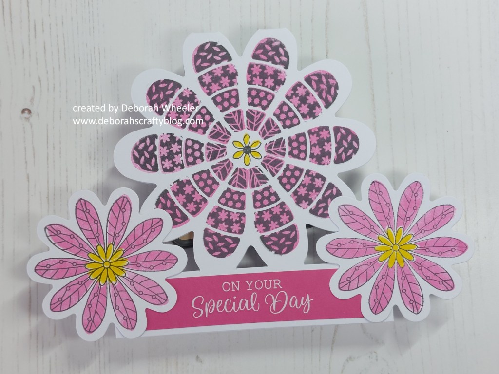 I was then on to assembly. I cut a piece of a lovely gold shimmery card I’ve had for ages and glued it onto the base of the petal card blank, before adding one of the white all occasions rub on sentiments. I could then glue the die cut toppers onto either side of the base before finishing with a shimmery gold dot in the centre of the large flower.