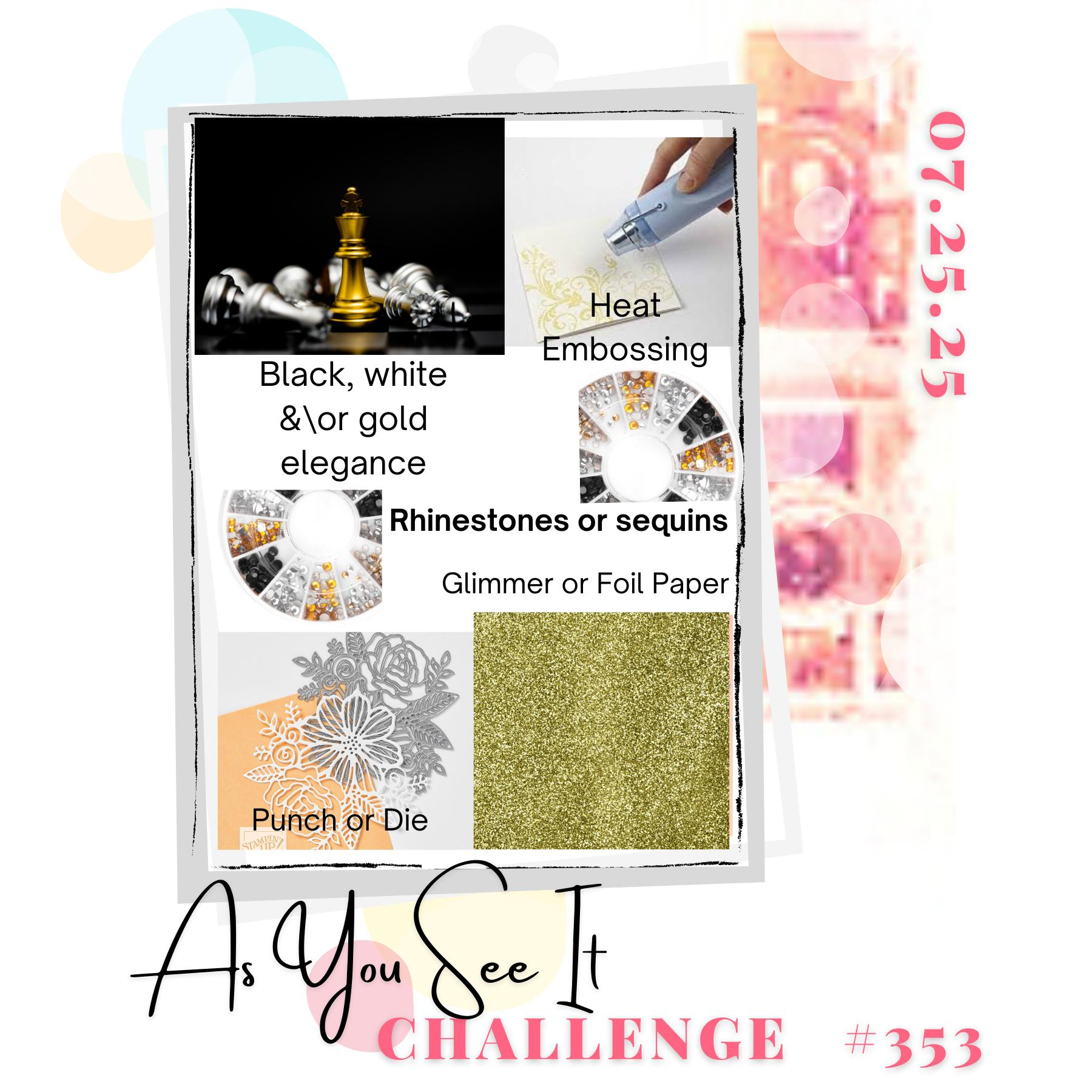 So, to check through our recipe at As You See It – I’ve gone gold & white on the card (hopefully you think it’s elegant…), obviously heat embossing, a rhinestone in the centre of the flower, die cut card toppers (that may be cheating a little bit!) and finally the gold shimmer card across the base. Job done!