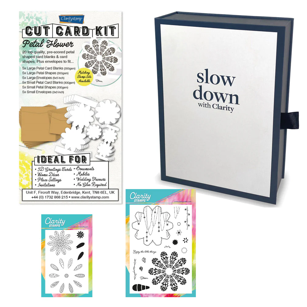 I’ve used Clarity’s petal flower cut card kit, with these lovely die cut blanks and matching stamps. My first step was to take one of the large card blanks, stamp the flower image onto it with Versamark clear ink and then heat embossing it with WOW’s gold powder. I then switched to the solid petal infill stamp and added ‘peacock feathers’ Distress Oxide to each of the petals in turn. Top tip – once you’ve finished inking, blot the image with a piece of kitchen towel, to lift any ink residue off the heat embossing and prevent smudges…!