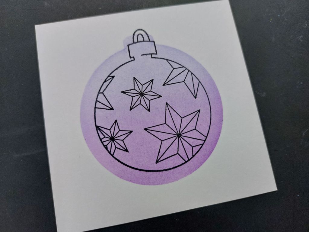 So, here’s my process… I started with one of Clarity’s small squares of stencil card and the 5×5 Christmas Bauble Aperture stencil, blending ‘shaded lilac’ and ‘wilted violet’ through it with my stencil brushes. Having stamped the starry bauble over the stencilled background, I highlighted the stars and the top with the Pergamano metallic gel pens, using the silver and purple ones to give a bit of depth to the images.