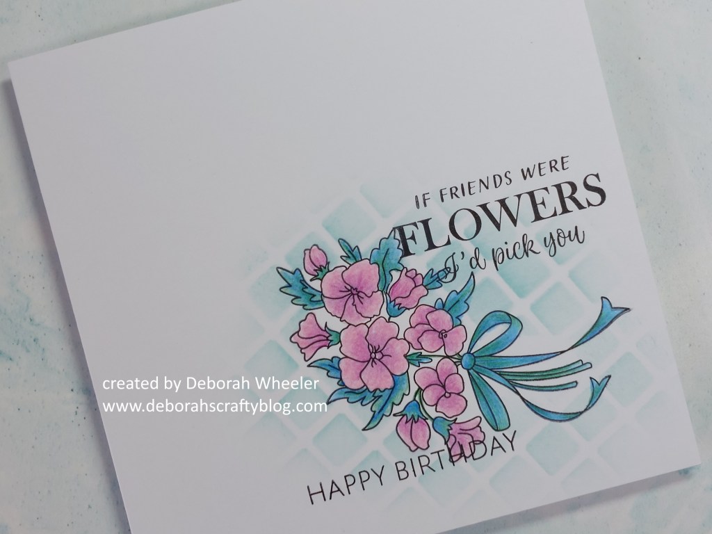 I turned to my favourite Pergaliner pencils to shade in the flowers – I love the way these blend together for additional colours, so used the turquoise, blue & green (B16, B4 & B7) for the the leaves & ribbon, then pinks (A9 & A7) for the flowers. One coloured, I simply added the sentiment from the Craft Club set, plus one of the occasions – happy birthday.
