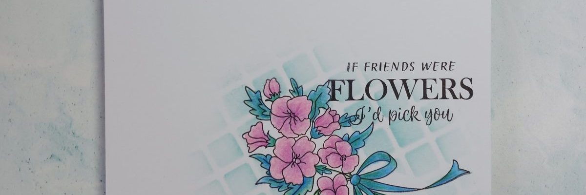 Hello everyone. I found time yesterday to play with the latest stamp from Clarity’s monthly Craft Club, which is this lovely bouquet of flowers and sentiment. You all know that I like to pick up themes, sketches, colours, etc from blog challenges and I pulled a few together with this card. I find colour palettes very helpful as otherwise all my cards are likely to be the same tones, however Seize the Birthday have asked for our favourite colour so that’s not much of a stretch! I love turquiose/teal tones (got quite a few in my house), but especially when combined with pretty pinks – perfect for this bouquet which also fits the ‘pretty flowers’ theme at Allsorts Challenge