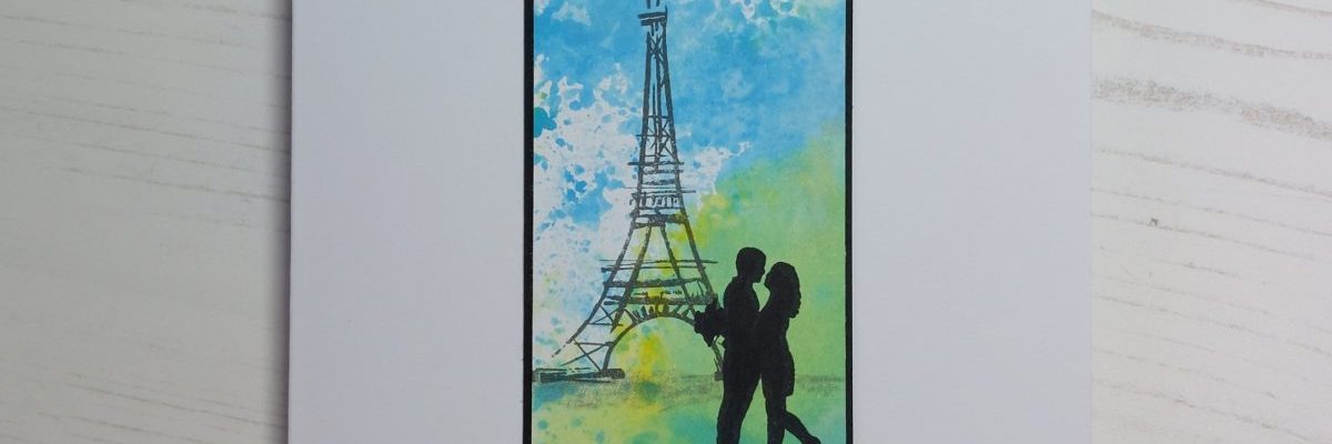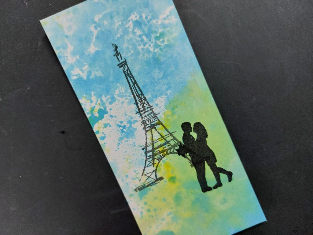 I dug a scrap of an inky mop-up out of my folder (haven’t used any of these for a while)and stamped the smaller Eiffel Tower onto it with ‘watering can’ Archival ink. I then added the couple from the Wee Folk set 1, this time using black Archival.