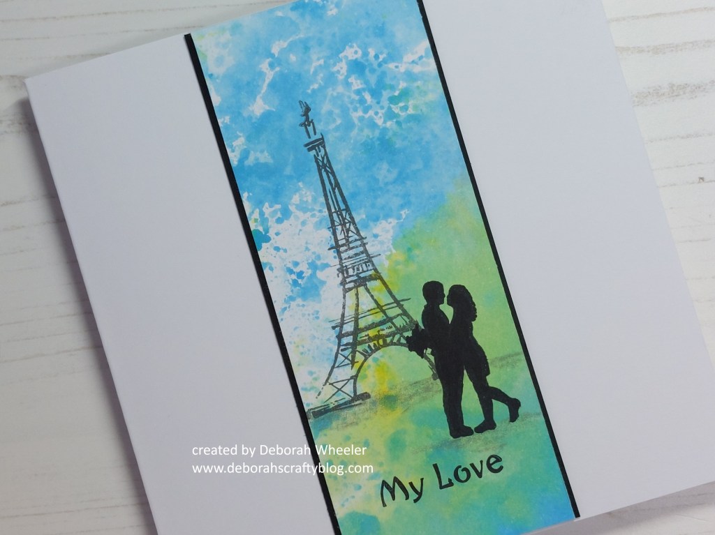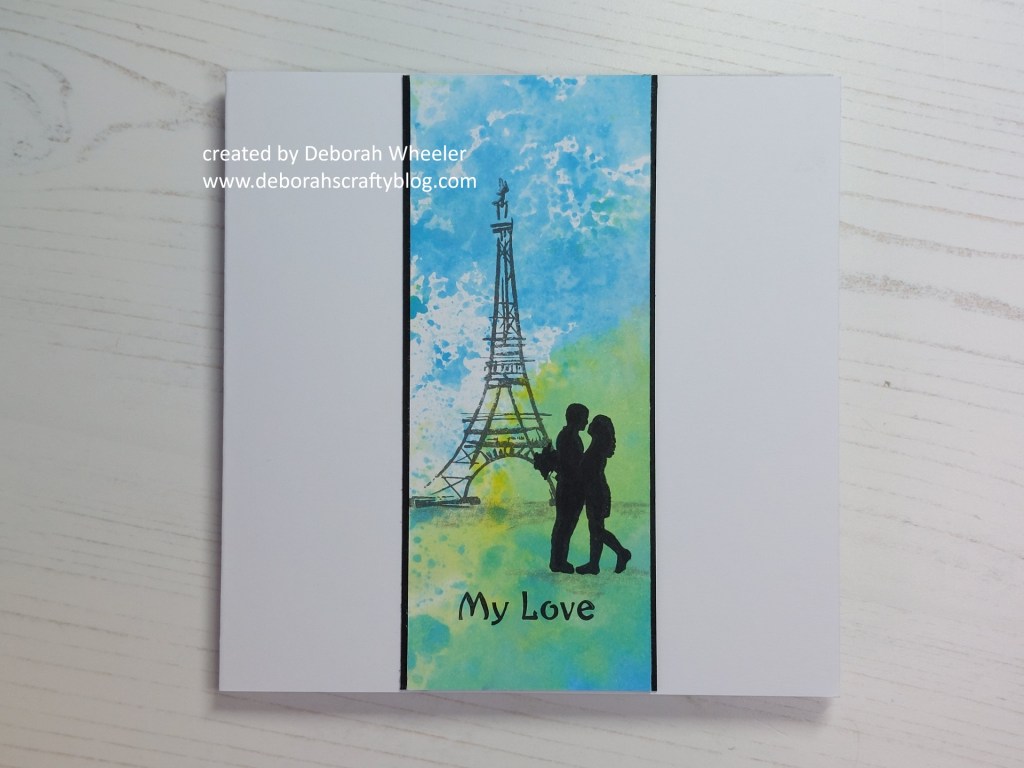 You may be able to just make out above that you can see the outline of the Tower through the couple, so I added a little ore depth to them with a black Sharpie (doing it very carefully!) and then stamped one of the essential sentiments. I glued a narrow strip of black card down each edge of the topper and attached it to a 5×5 card blank.