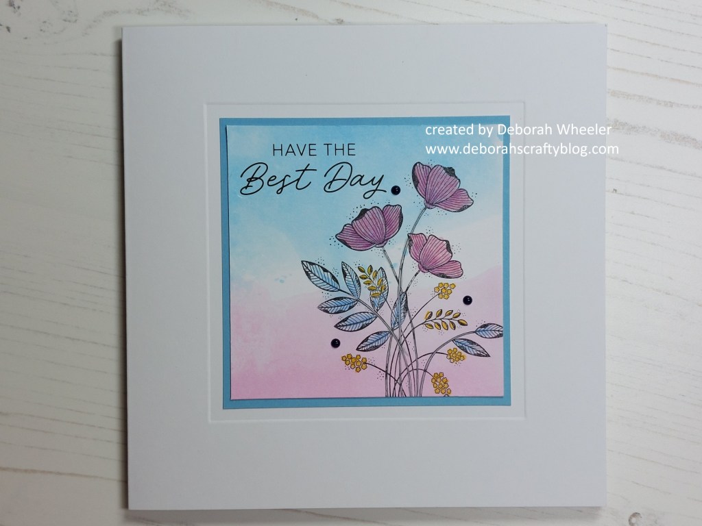 I added a Rub On sentiment from the Birthday set and a mount of companion per. Having embossed a frame onto the front of a 6×6 card blank using a square embedder, I attached the topper to the card front. My final finishing touch was to add three small black enamel dots around the flowers to complete the third challenge – I used to use these a lot but have got out of the habit recently and it’s always good to pull previous styles in.