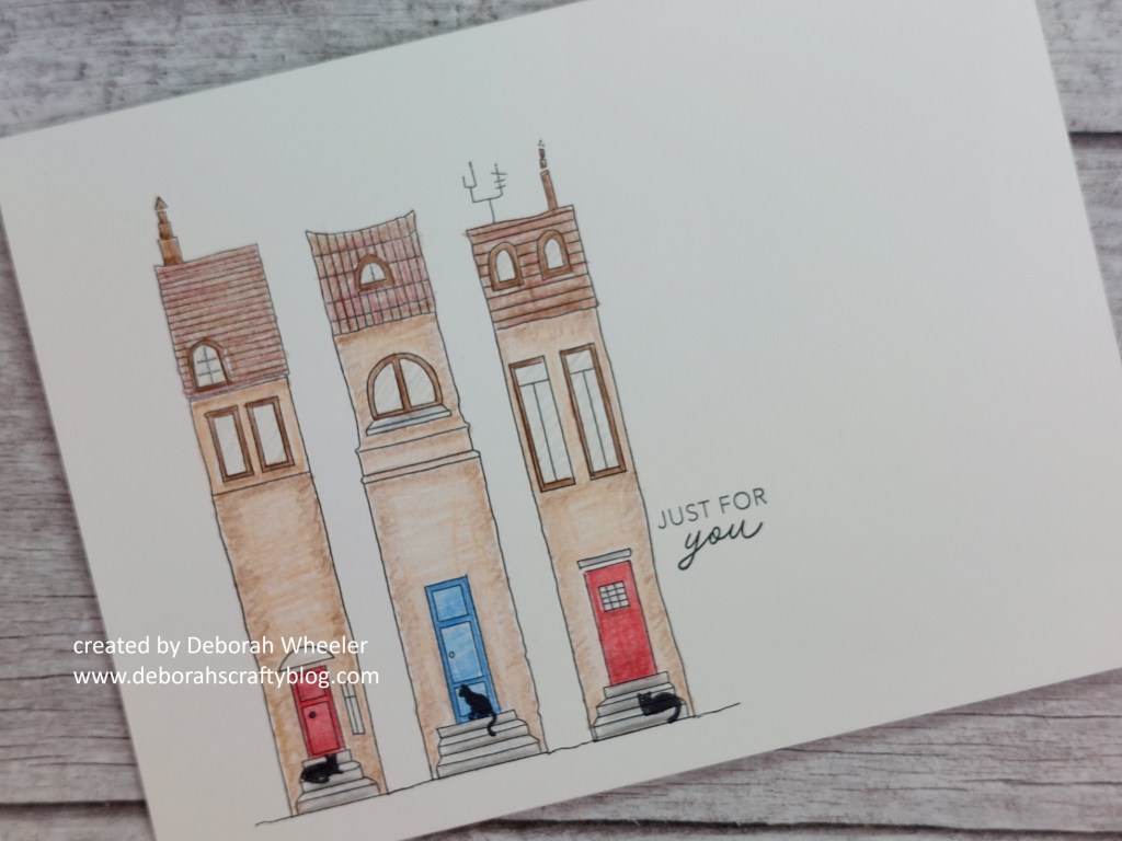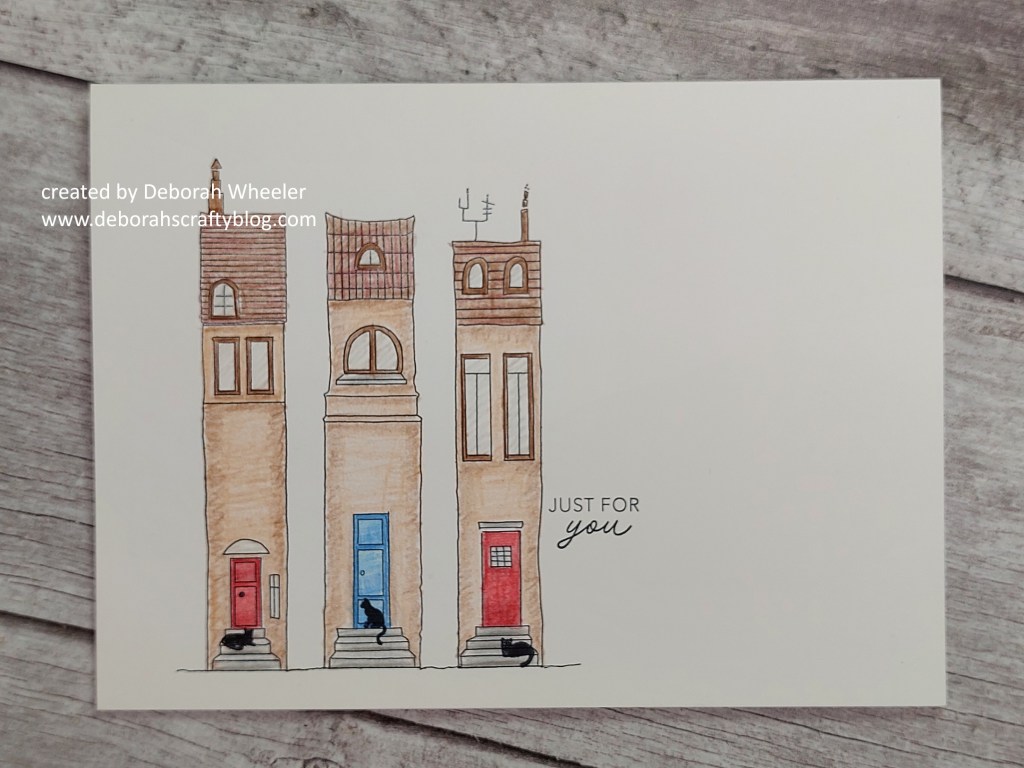 So, here’s the quick rundown on my process. I stamped three of these fab houses onto an A5 card blank in landscape orientation, using black Archival ink and then shaded them with Pergaliner pencils. I kept my colouring quite loose on the houses to try and give the effect of texture on the walls.
