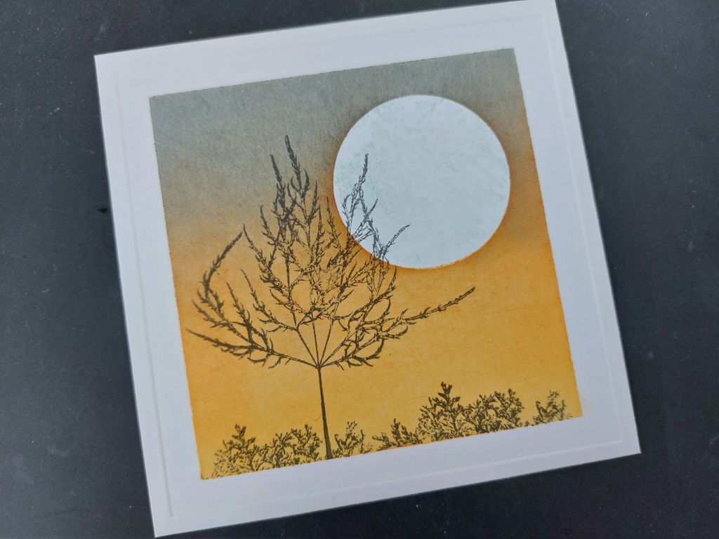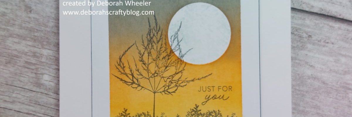 I switched the moon mask for the outer part and found the grunge texture stamp (#187) from Clarity’s Craft Club back in 2023. I inked the stamp with ‘speckled egg’ Distress Oxide and stamped it across the moon. Next was to add one of the Elementree stamps in watering can, using the top of another of them to add the foliage across the ground. Once I’d done all that, I could remove the low tack tape.