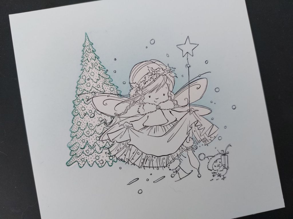I stamped Presh onto a 5×5″ piece of stencil card and cut a mask for her from Clarity’s blank material. I then added the tree from Linda’s Home for Christmas set in ‘library green’ Archival to sit behind her. Now it was a bit smaller than I wanted so I covered it with a mask and then restamped the lower part beneath it to make it taller – the key to doing this is to line up the edge of the tree with the stamped image.