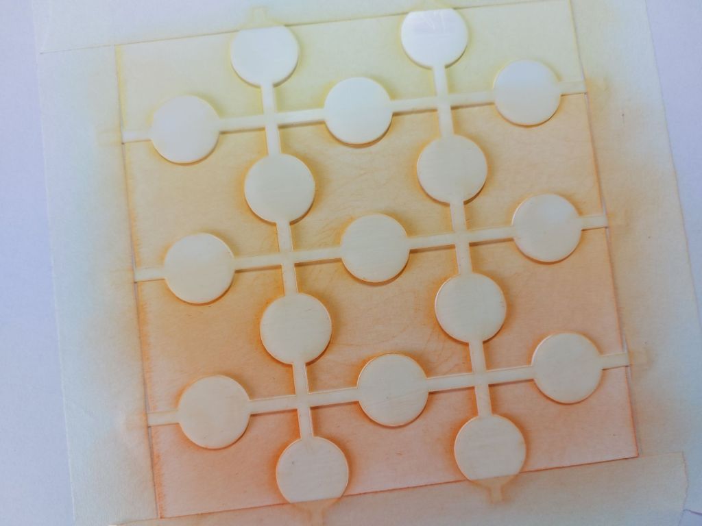 I started with a square of Clarity’s stencil card that I’d cut down to be slightly smaller than the stencil. That meant I could lay it over the card and attached it to a piece of scrap paper underneath using low tack tape – it’s a frameless stencil so I couldn’t hinge it to the card as I normally would. I then blended three shades of Distress Oxide across it with my stencil brushes – ‘squeezed lemonade’, ‘carved pumpkin’ and ‘ripe persimmon’.