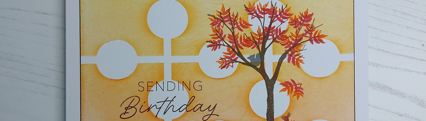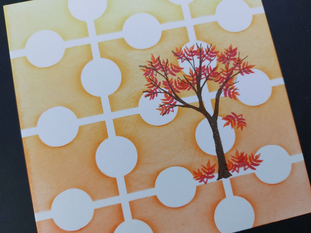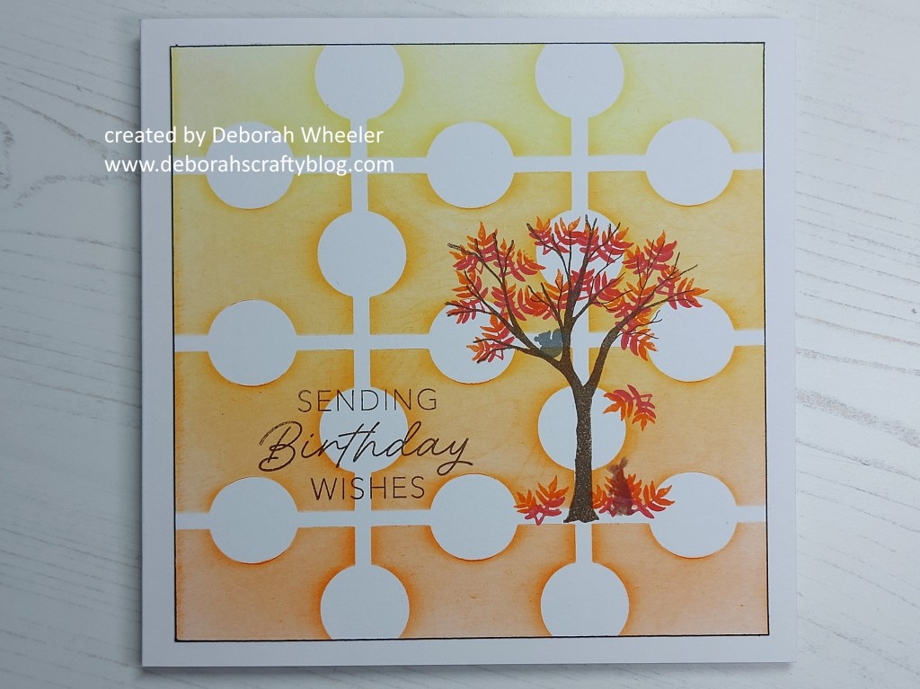 Hello crafty friends. I’ve been playing today with another of the goodies from September’s Clarity Craft Club – this time the stencil (#136 square framework). I said the other day that I need to make better use of my stencils stash, so this is a good start. It’s a great background and I built a little autumnal scene onto it with the Woodland Treescape stamp set.