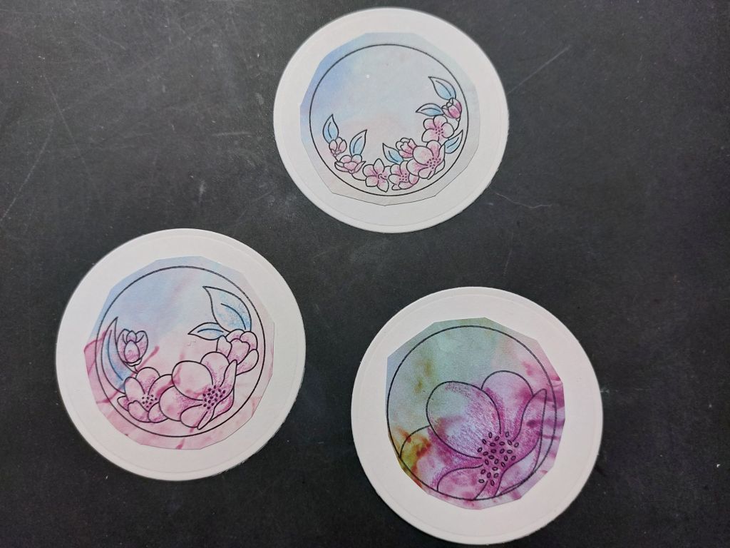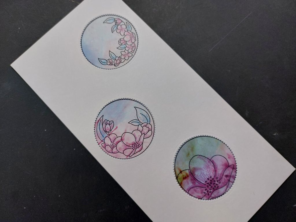 The first step was to cut an 8×8 card blank into half to give me a top fold, then cut a piece of stencil card slightly smaller. I used one of the nested circle picot dies to cut three apertures into it. I then stamped three outline images onto a piece of Antarctica designer paper and added a little shading with Pergaliner pencils, before trimming them down and mounting them onto die cut circles of card – these needed to be larger than the apertures so that I had the surround to glue them into place.