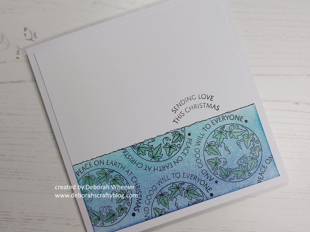 I do love an inked panel and haven’t done one for a while, so time for a revisit I thought! I first cut a piece of stencil card slightly smaller than a 6×6 card blank and used low tack tape to mask off the lower third for my panel. I then brushed ‘peacock feathers’ and ‘uncharted mariner’ Distress Oxides across it, keeping it light and gradually building up the colours to blend them together for a lovely ombre effect. I could then stamp the semi-circle sentiments across the panel in black Archival ink – I didn’t go right over to the right-hand side as I wanted to make sure I had enough space to add the ivy circles.