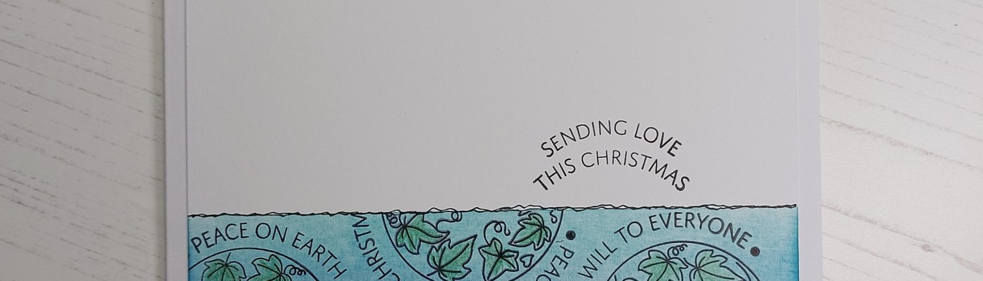 I do love an inked panel and haven’t done one for a while, so time for a revisit I thought! I first cut a piece of stencil card slightly smaller than a 6×6 card blank and used low tack tape to mask off the lower third for my panel. I then brushed ‘peacock feathers’ and ‘uncharted mariner’ Distress Oxides across it, keeping it light and gradually building up the colours to blend them together for a lovely ombre effect. I could then stamp the semi-circle sentiments across the panel in black Archival ink – I didn’t go right over to the right-hand side as I wanted to make sure I had enough space to add the ivy circles.