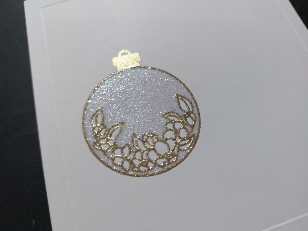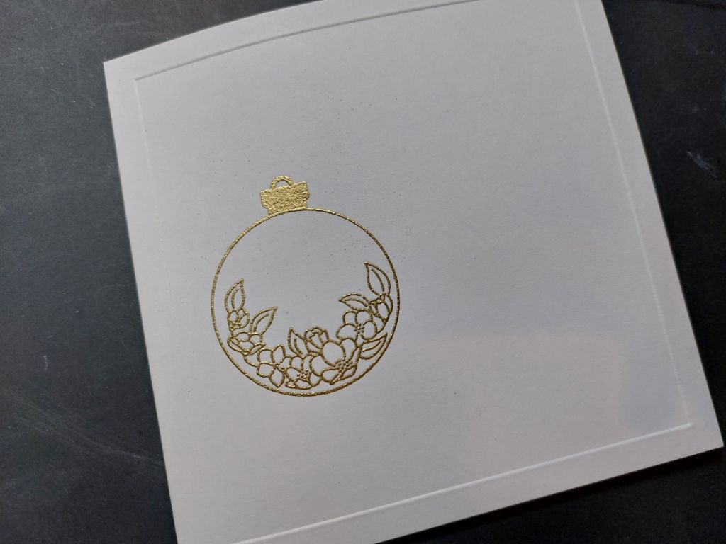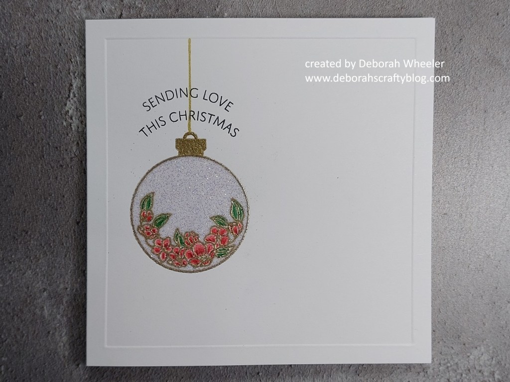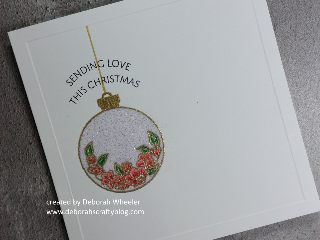 I went for a one layer design on this one, starting by embossing a frame onto a 5×5 card blank using a square embedder. Next was to stamp one of the floral images with Versamark clear ink and heat emboss it with WOW’s super fine gold powder; I then added the little bauble topper from another Christmas set that I think is no longer available on the website (sorry! When I find the details I’ll add them in…) I switched to the matching silhouette stamp, inked that up with the clear Versamark and then heat embossed it with WOW’s clear sparkle powder.
