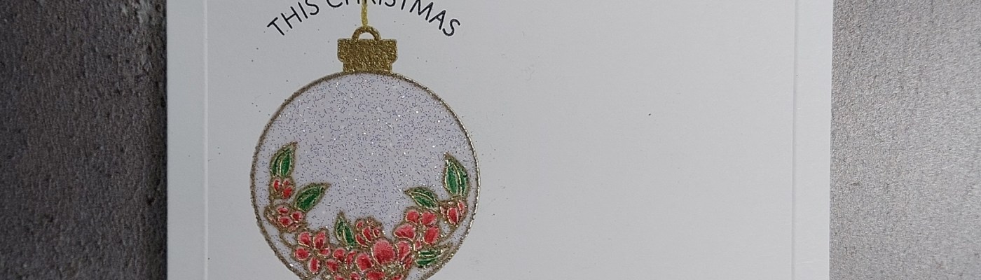 I shaded in the flowers and leaves with red & green Pergaliner pencils, then used a gold Posca pen to hang the bauble on a string. Finally I added the two curved sentiments from the set to complete the picture.